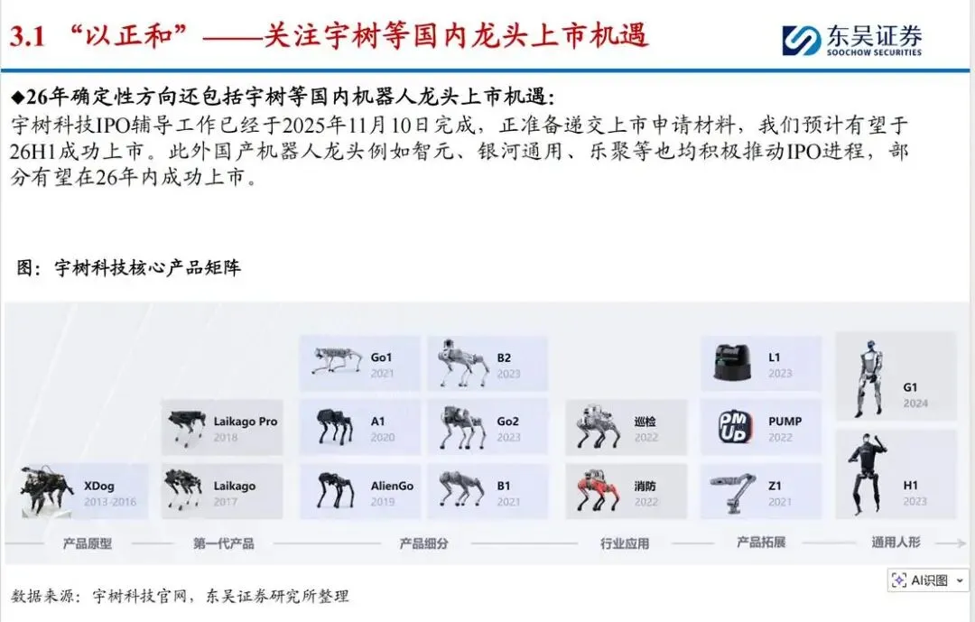 国产链迎来机遇,宇树 2025 年完成IPO 辅导,2026H1 有望上市,智元、银河通用等国产龙头也在推进 IPO 进程,部分或于 2026 年内上市。