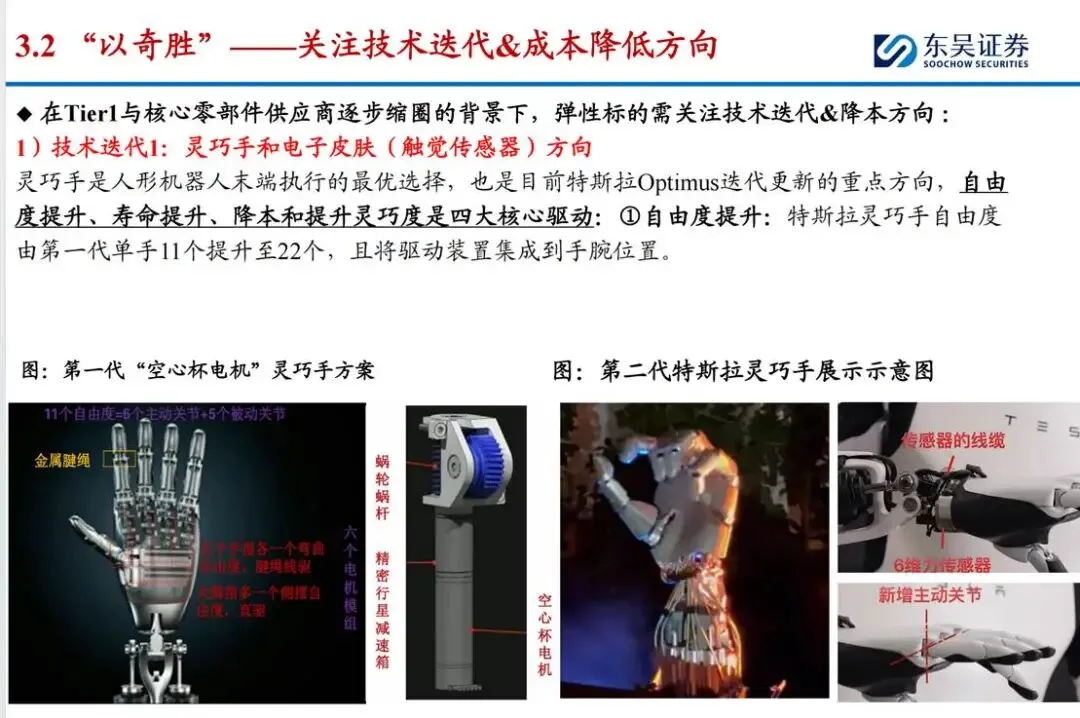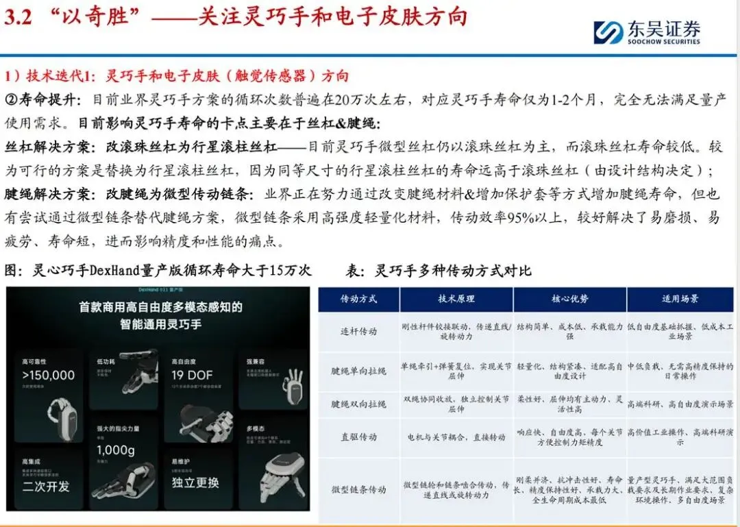 灵巧手 + 电子皮肤:四大驱动为自由度、寿命、降本、灵巧度提升,核心改进包括行星滚柱丝杠替代滚珠丝杠、微型链条替代腱绳、冷镦工艺降低微型丝杠成本、导入电子皮肤 / 触觉传感器提升力控精度。