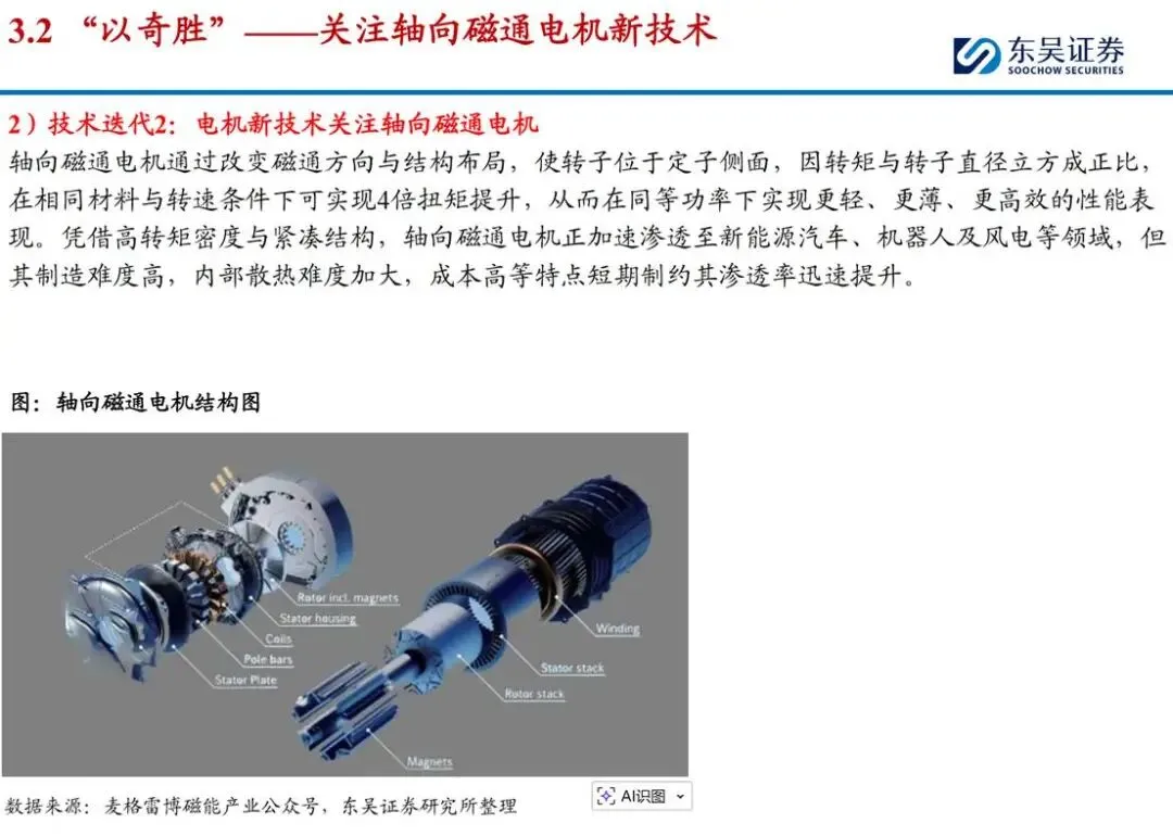 轴向磁通电机:相较传统电机转矩密度更高、结构更紧凑,正加速渗透,是电机环节核心技术升级方向,仅短期受制造、散热、成本问题制约渗透率。