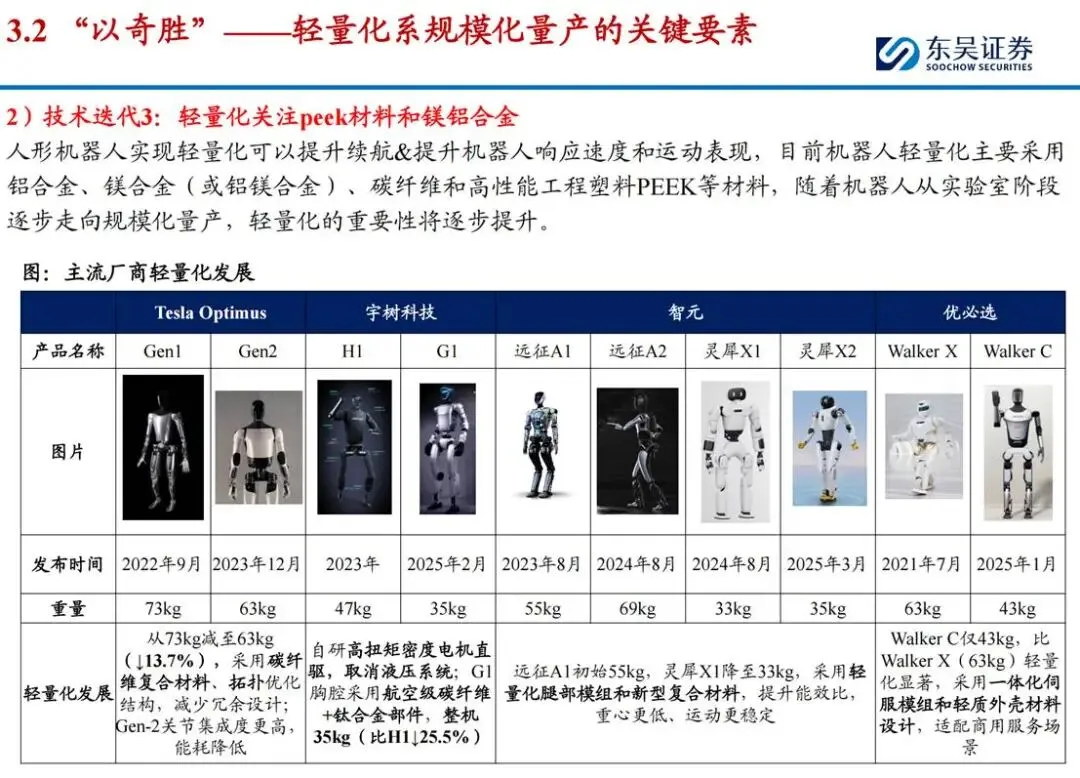 轻量化材料:量产背景下轻量化重要性凸显,可提升机器人续航和运动表现,PEEK、镁铝合金为核心关注方向,特斯拉、宇树、智元等主流厂商均已实现不同程度的轻量化升级。