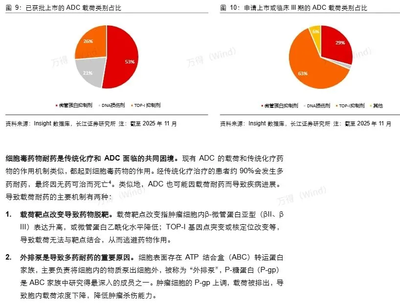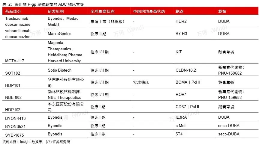 既然P-gp外排泵导致药物排出,直观的研发思路肯定是寻找pgp的抑制途径,但是研报中说这个难度非常大,具体的原因恕我生化基础差,看不太懂。反正新的思路就是寻找非P-gp底物载荷:如杜卡霉素类似物、奈莫柔比星代谢物PNU-159682和α-鹅膏蕈碱,避免外排泵排出(典型管线见下边截屏3)