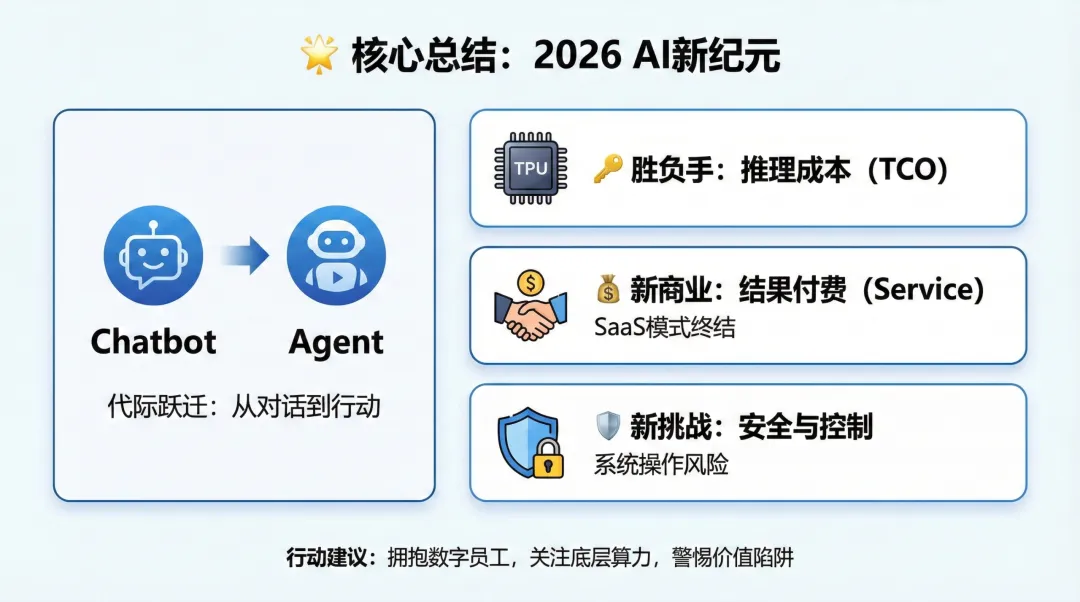 💡 建议关注:企业应开始测试引入“AI员工”流程,而非仅仅部署AI助手;投资者需警惕传统SaaS企业的价值陷阱,关注拥有底层算力或能通过AI交付最终结果(Service)的公司。