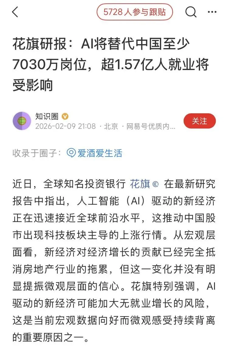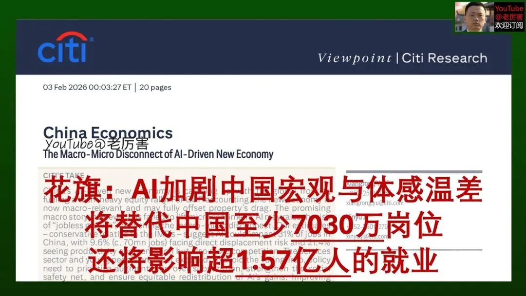 最后我们总结一下,花旗报告给出的预警非常明确,AI 带来的生产率提升是一把双刃剑。对于中国而言,AI 是破除房地产依赖的良药,但如果不能通过人力赋能,让 1.57 亿人学会驾驭 AI 而不是被取代,和二次分配(税收与福利改革)来缓解微观层面的压力,这种增长可能会在社会层面产生巨大的反向拉力。