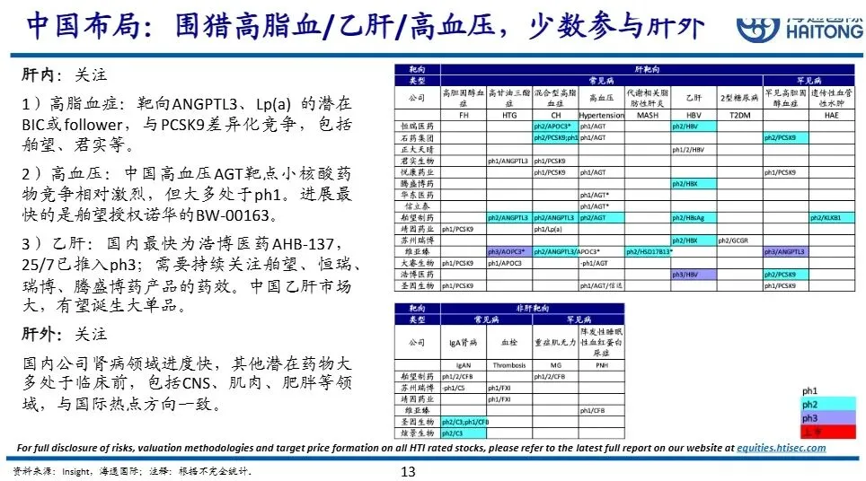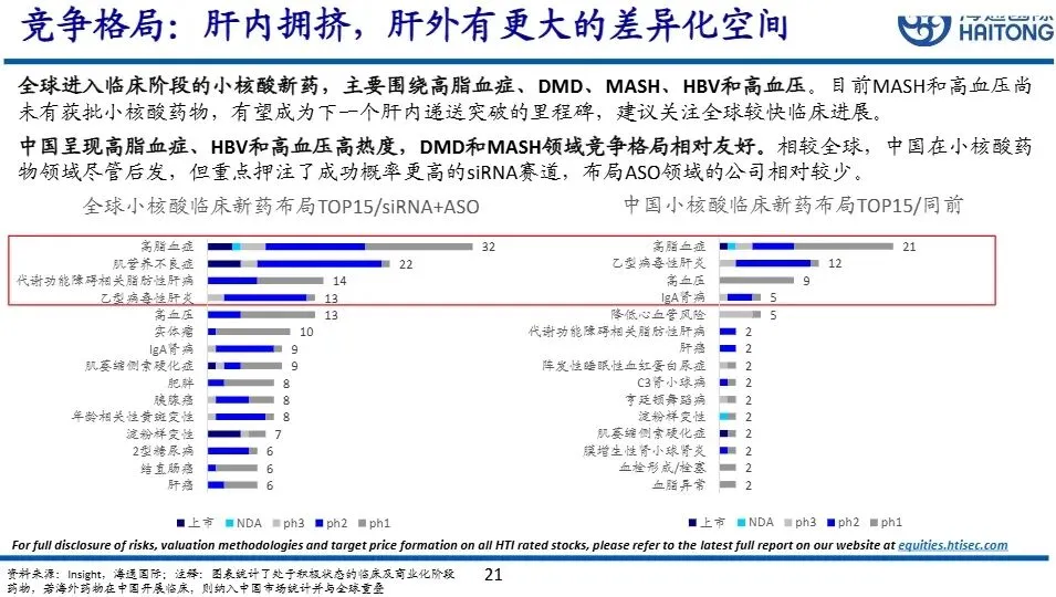 肝内赛道(如高血脂、乙肝、高血压)竞争激烈,而肝外赛道(如肾病、CNS、肌肉疾病)则存在更大的差异化空间。