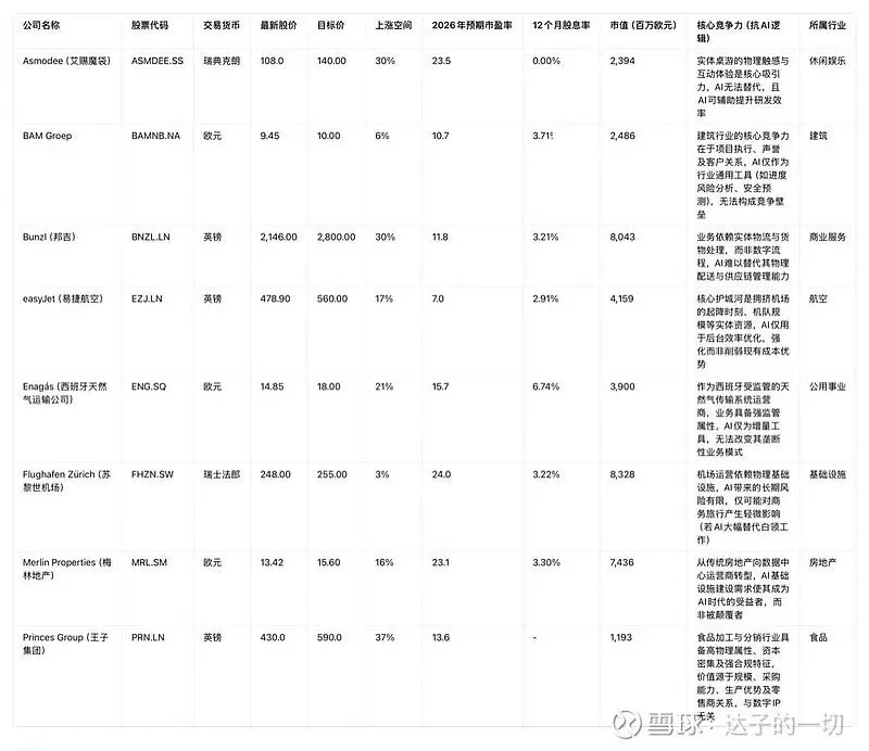 1.物理资产依赖:业务核心围绕实体货物、基础设施或物理互动,如Bunzl的物流配送、苏黎世机场的航站楼设施、Asmodee的实体桌游,AI无法替代物理场景的价值;