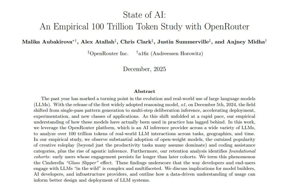 本文来源于OpenRouter与a16z(Andreessen Horowitz)于2025年12月联合发布的《State of AI: An Empirical 100 Trillion Token Study》。该报告基于OpenRouter平台超过100万亿Token的真实交互数据,深入分析了大语言模型(LLM)在实际应用中的演变趋势、用户行为及市场格局。