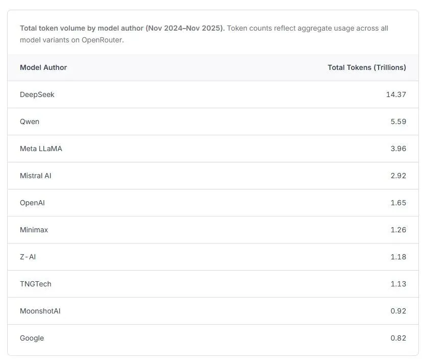 特别值得关注的是中国开源模型的崛起。从 2024 年末不足 2% 的周使用份额,中国开源模型在 2025 年部分周次达到近 30% 的峰值,全年平均约 13%。DeepSeek 以 14.37 万亿 token 的总量领跑,Qwen 紧随其后达到 5.59 万亿。这些模型不仅在数量上增长,更在质量和应用场景上实现了突破。