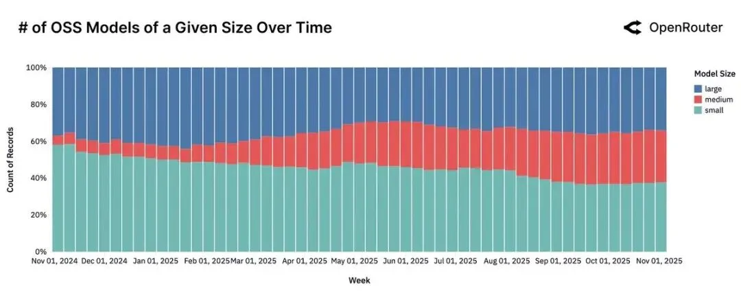 模型规模的市场偏好发生了显著变化。过去一年,小型模型(<15B参数)的使用份额持续下降,而中等规模模型(15B-70B参数)快速崛起,成为“新的小模型”。