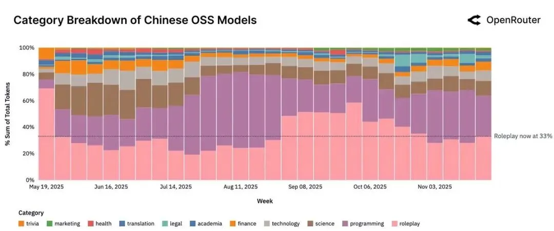 角色扮演与创意对话占据开源模型使用量的 52%,远超预期。这不是简单的闲聊,而是包括游戏角色扮演、互动小说、角色模拟等结构化创意任务。开源模型在这一领域的优势在于更少的内容限制和更强的可定制性。到 2025 年末,角色扮演流量在闭源、西方开源和中国开源之间形成均衡分布。