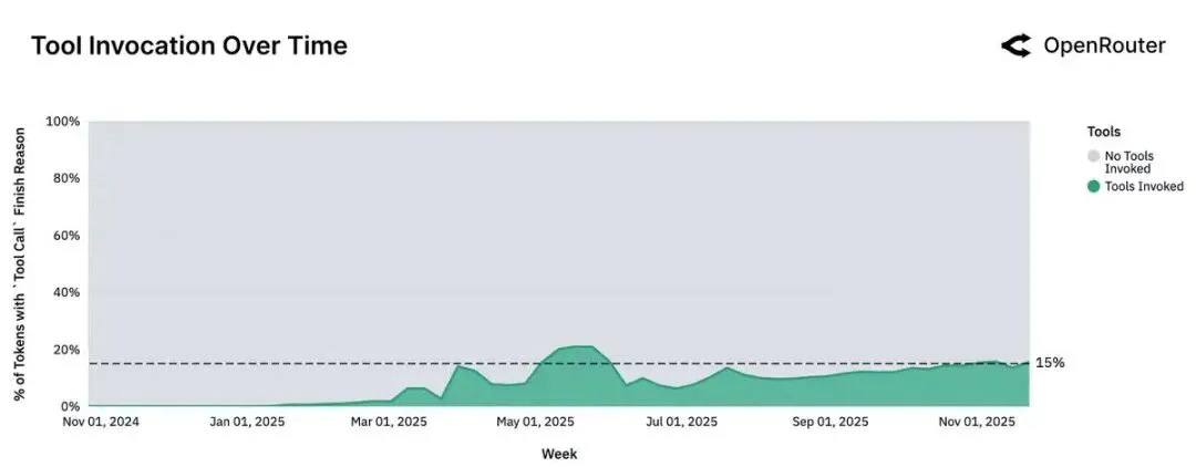 工具调用的普及:实际调用工具的请求稳步增长,Claude 系列、Gemini 和 GPT-4 系列引领这一趋势。到 2025 年末,Grok-3 和 Gemini 2.5 成为工具调用的主要模型。