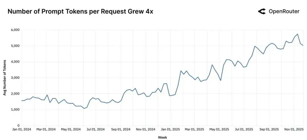 上下文的爆炸式增长:平均提示词长度从 2024 年初的 1.5K token 增长到 2025 年末的 6K token 以上,增长近 4 倍。完成 token 也从 150 增长到 400。这一变化主要由编程任务驱动,反映了模型从“创意生成器”向“分析引擎”的转变。