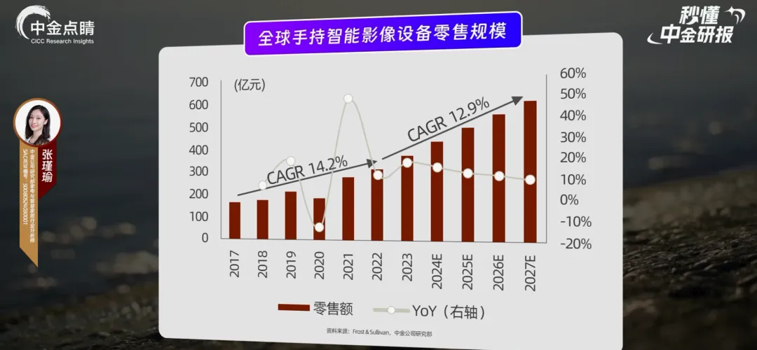 为什么能涨这么快?其实就藏在我们的日常里:一方面,抖音、小红书这些平台把 “内容创作” 变成了全民活动。2023年我国短视频用户规模超十亿,总有一部分人想从 “看客” 变成 “创作者”—— 以前用手机拍 vlog,现在觉得 “不够酷”,就会想买全景相机拍 360° 画面,需求自然就上来了。根据 Frost & Sullivan,2017 年全球全景相机零售市场规模为 25.1 亿元,2023 年达到50.3 亿元,2027 年预计达到 78.5 亿元,年复合增长率达11.8%。