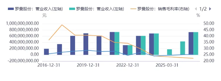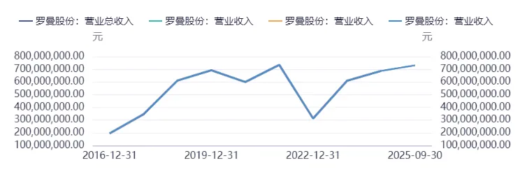 罗曼股份近年来的营业收入和利润呈现波动趋势。2021年,罗曼股份的营业收入为7.36亿元,随后在2022年大幅下降至3.12亿元。2023年,公司营业收入回升至6.1亿元。然而,2024年的营业收入继续增长至6.88亿元,但2025年前三季度下降至7.32亿元。归母净利润方面,2022年下降至-1510.78万元,2023年回升至8053.93万元,2024年利润继续上升至-3484万元。2025年前三季度,归母净利润为2108.63万元。这些数据表明,罗曼股份在营业收入上表现出色,但盈利能力波动较大。