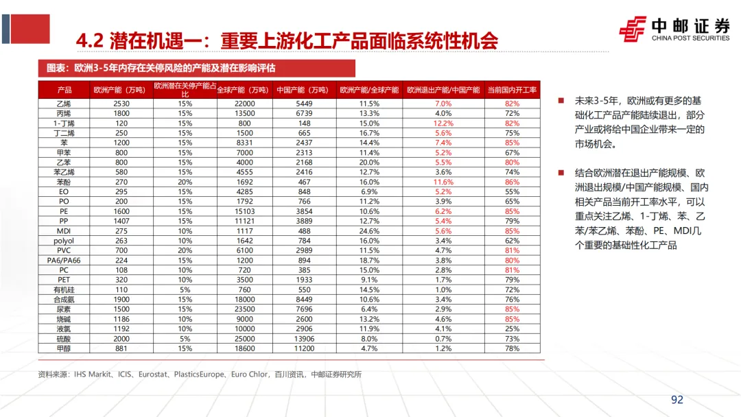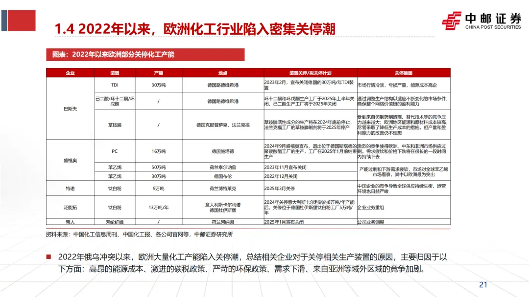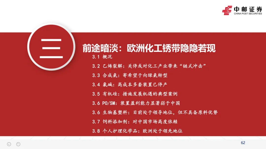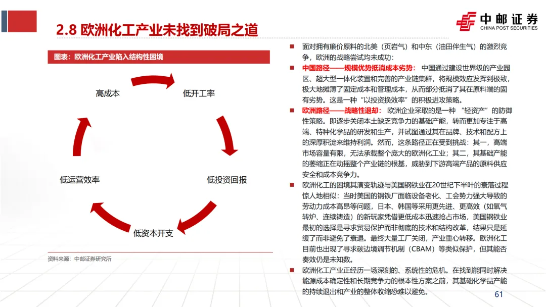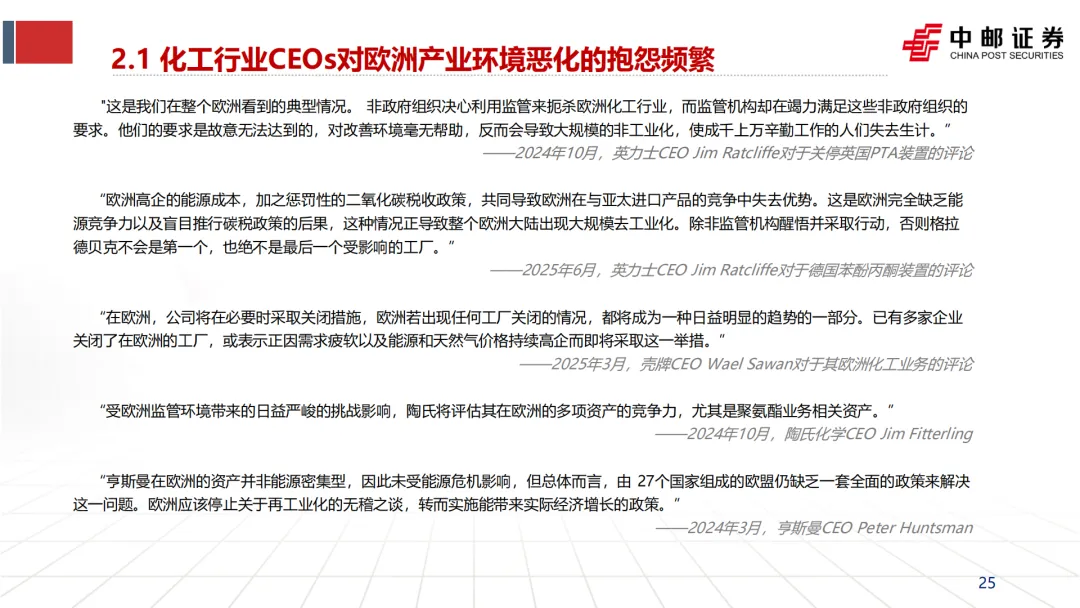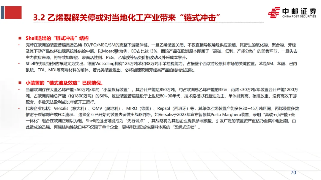 引发并加速“去工业化”:英力士、壳牌等企业CEO在关停装置时,均将“高昂的能源成本”列为首要原因(见文档第25页企业评论)。这直接导致了欧洲乙烯、合成氨、氯碱等基础产能的关停潮。