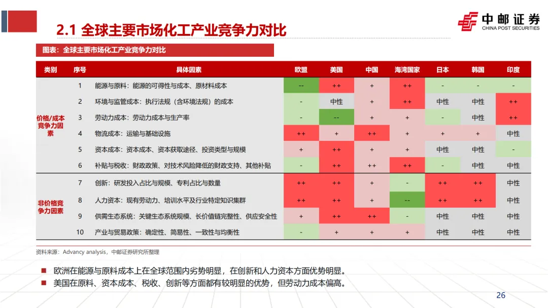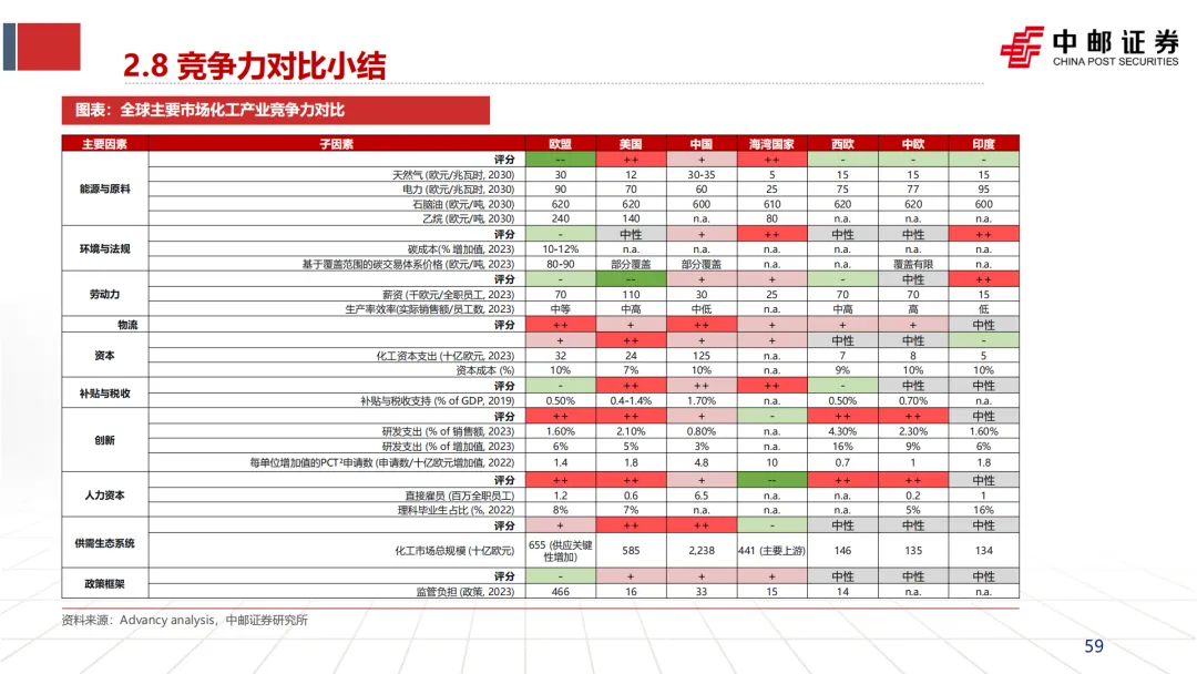 削弱全球竞争力:在文档的全球化工产业竞争力对比表中(第26、59页),欧洲在“能源与原料成本”项上的评分为“--”(显著劣势),而美国为“++”(显著优势),中国为“+”(优势)。文档预测,到2030年,欧洲天然气价格仍将是北美价格的2-3倍。