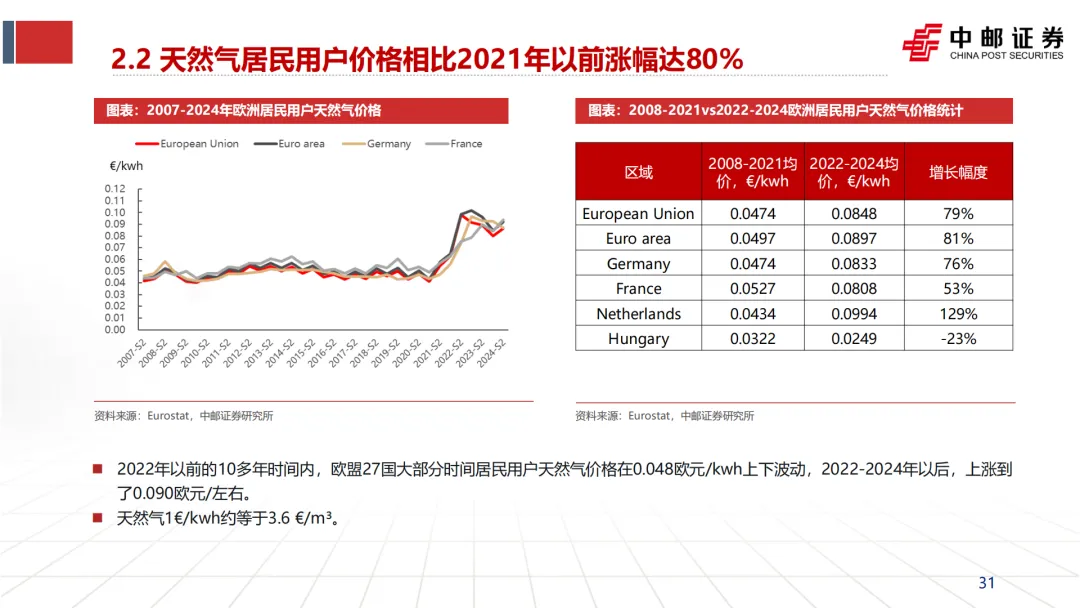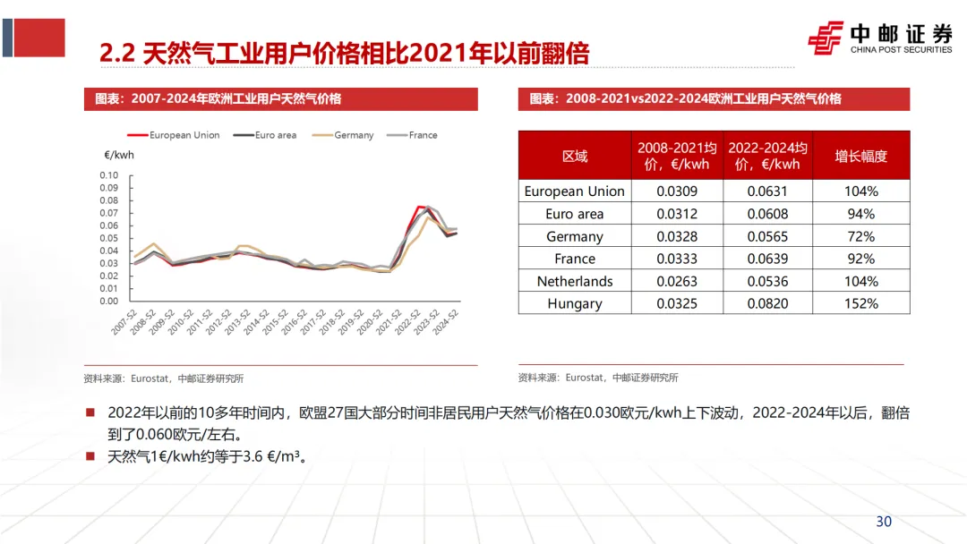 工业用户:2022-2024年期间,欧盟27国工业用天然气均价为0.0631欧元/kWh,相比2008-2021年的均价(0.0309欧元/kWh)上涨了104%。德国、法国、荷兰等主要工业国涨幅在72%-104%之间。