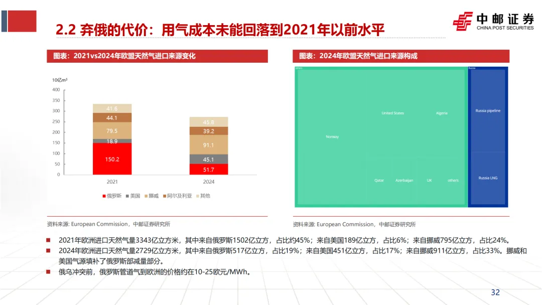 冲突前(2021年):欧洲进口天然气中约45%来自俄罗斯(主要是管道气),价格低廉(10-25欧元/MWh)。