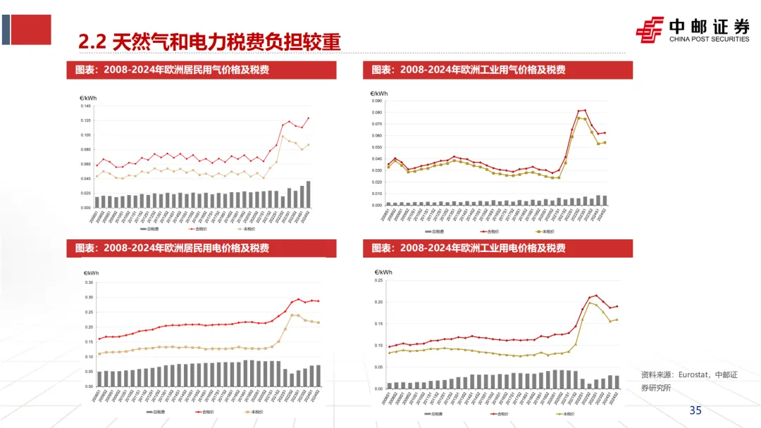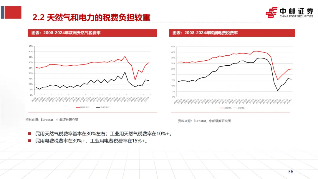 重税费:欧洲对能源征收高额税费。民用天然气税费率约30%,工业用约10%+;民用电力税费率30%+,工业用电15%+。这些税费进一步放大了能源价格的市场劣势。