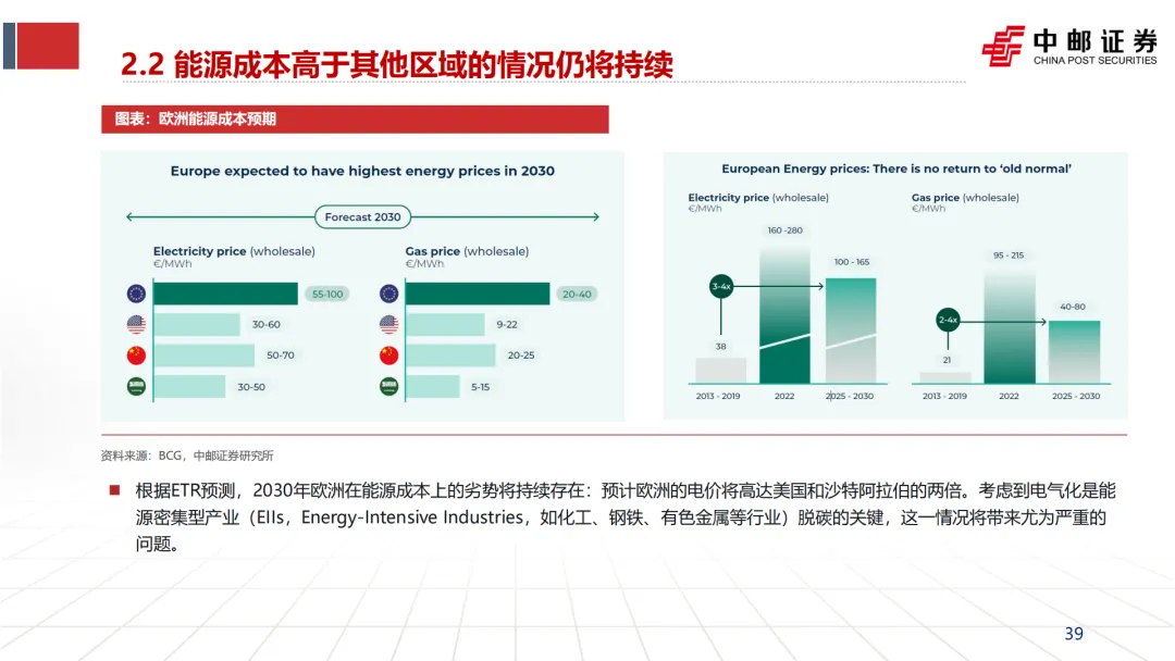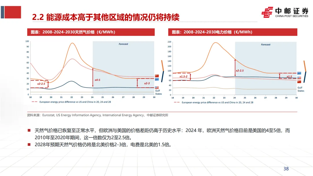 文档引用多家机构预测,认为欧洲在能源成本上的劣势是结构性的,短期内难以逆转。