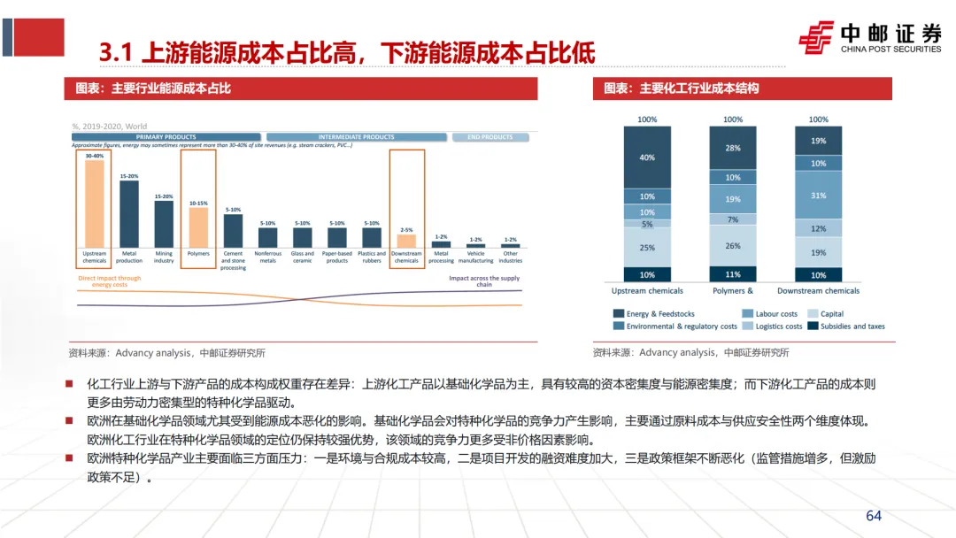 消费结构:2022年,天然气在欧洲化工行业的直接能源消费中占比高达33%。此外,电力占30%,而电力生产中天然气发电也是主要形式之一。因此,天然气成本直接影响化工生产的全链条能源成本。