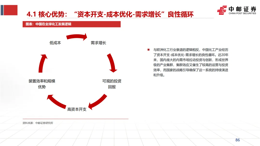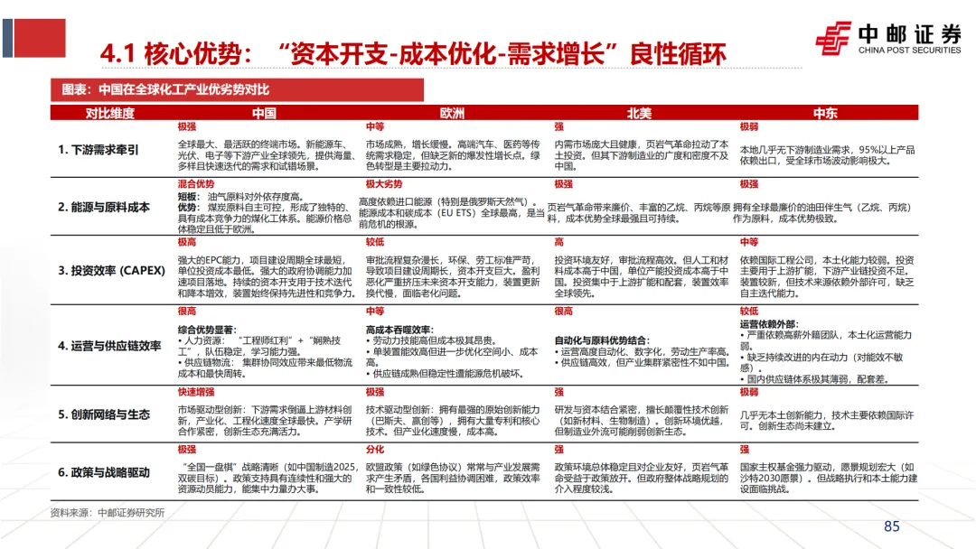 总结:在本文档的分析框架内,天然气是剖析欧洲化工产业危机最关键的切入点之一。其价格因地缘政治冲突而结构性上涨,并与碳成本、环保政策叠加,共同导致了欧洲化工行业高昂的生产成本。这使得欧洲在基础的大宗化学品领域完全丧失了与北美(廉价页岩气)、中东(廉价油田伴生气)乃至中国(规模效应与煤炭原料组合)的竞争力,从而陷入“高成本 -> 低开工率 -> 低投资回报 -> 资本开支不足 -> 竞争力进一步下滑”的“死亡循环”。这一分析为理解欧洲化工产能退出、以及中国可能承接的市场机会提供了核心的成本逻辑基础。