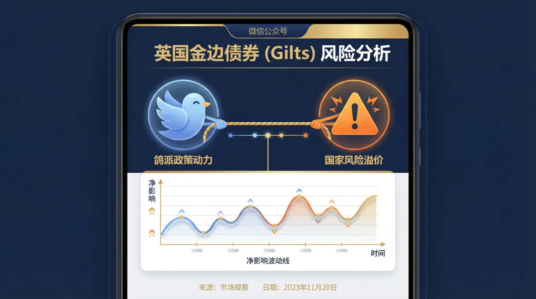 图一:英国金边债券 (Gilts) 政策冲动 vs 国家风险分析。这张图形象地展示了英国金边债券市场是如何在“鸽派政策冲动”(央行可能降息)和“国家风险溢价”(政治经济不确定性)这两种力量的拉扯下,呈现出波动的净影响。当政策冲动占上风时,债市可能表现良好;反之,风险溢价上升则会带来压力。