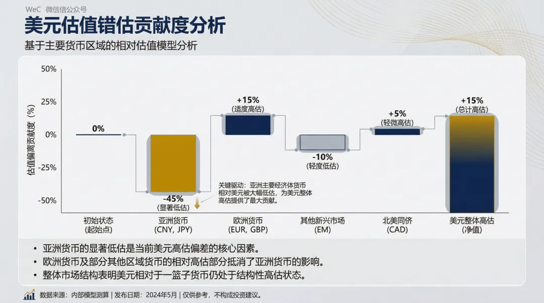 图二:美元估值错估贡献度分析。这张图清晰地揭示了美元的估值错估是如何由不同区域货币贡献的。高盛的模型显示,目前美元的高估几乎完全归因于亚洲货币(尤其是人民币和日元)的低估。这意味着,随着亚洲经济体的崛起和货币政策的调整,美元的强势地位将面临持续的挑战。
