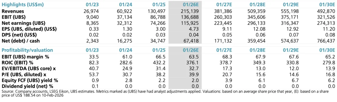 Summary鉴于股价表现平平、供应链信号仍然偏强,以及管理层似乎对市场当前对增长和利润率可持续性的质疑感到不满,当前财报的风险回报比似乎偏正面——尤其是在我们即将进入下个月 GTC 大会之际。我们预计 2026 财年第四季度(1 月)收入约为 675 亿美元——约高于指引 25 亿美元。来自中国的任何收入回补仍然存在疑问,因为中国正在开始大量使用本土 GPU——但若以 AMD 作为参考,我们可能会看到额外数十亿美元收入进入中国市场,这部分收入可能会叠加在 2026 财年第四季度结果之上。我们认为英伟达在指引中可能会剔除中国因素,我们预计 2026 财年第一季度(4 月)收入约为 760 亿美元,并认为投资者对收入指引的心理预期区间大致在 740–750 亿美元之间。 在短期内,我们未看到任何因素使我们偏离英伟达 75% 毛利率指引区间,尽管投资者已开始质疑这一水平的可持续性,原因是来自 Google / AVGO TPU 的潜在威胁——这一讨论英伟达必然会在电话会议以及 GTC 上进行回应(尤其是在 Groq 交易背景下)。我们的新预测接近我们对 2026 日历年产量的估计(约 950 万台),但我们仍然认为渠道库存中仍有更多缓冲空间。 最后,在关键指标方面,我们注意到,仅在本轮财报周期中,2026 年 hyperscale 资本开支就增加了约 1450 亿美元(约 25%),目前资本开支同比增长约 60%,且主权需求仍处于早期阶段。基于我们的供应链调研,我们再次上调预测,目前 2026/2027/2028 年每股收益分别为 9.11 / 12.08 / 12.92 美元,今年收入约 3810 亿美元(其中数据中心约 3570 亿美元),明年约 5090 亿美元(其中数据中心约 4840 亿美元)。鉴于当前存在诸多争论,我们怀疑该股估值难以超过未来 12 个月每股收益的 20 倍,因此我们的目标价从 235 美元小幅上调至 245 美元,并维持“买入”评级。 Analysis / Key Highlights UBS 全球团队近期将台积电 CoWoS 产能预测从 2026 年年底的 11 万片/月上调至 12 万片/月,并认为英伟达将是产能提升的主要受益者之一。我们预计全年行业 CoWoS 产能将达到约 155 万片晶圆,比此前预测高 6%。 基于新的 CoWoS 预测,我们预计英伟达在 2025 年日历年生产约 690 万台,在 2026 年生产 950 万台(见图 1),相比我们自身 GPU 模型中 2025 年 570 万台、2026 年 930 万台的预测,这意味着英伟达在 2026 年初将带着额外库存进入年度,无论是在公司账面上还是供应链中。 在 2025 年 10 月 28 日的 GTC DC Keynote 上,英伟达预计其 Blackwell + Rubin 在 2024–2026 年期间出货 2000 万颗 GPU 或 1000 万颗芯片(因 Blackwell 和 Rubin 为每芯片 2 GPU)。我们预计同期芯片出货约为 1030 万颗(此前约 900 万颗),但鉴于 2026 年 CoWoS 强劲扩产,我们认为仍存在进一步上行空间。 我们目前预计 2025 年 GPU 出货为 570 万台,2026 年提升至约 900 万台(同比增长 56%)。在结构方面,我们预计 2025 年出货结构约为:Hopper 占 20%,Blackwell 占 36%,Blackwell Ultra 占 43%。在 2026 年,我们预计 Blackwell Ultra 占约 77%,Rubin 占 19%(包括 VR 和 CPX 芯片),并预计 Hopper 世代(H20 和 H200 中国出货)约占 2%。我们的单位预测包括 VR CPX 芯片(VR200 约三分之一附加率)以及 Vera CPU(VR200 约一半附加率)。 除围绕 AI 支出可持续性/投资回报率以及毛利率竞争可持续性的常规投资者争论之外,我们希望听到英伟达回应我们近期听到的关于 CUDA 护城河的担忧,尤其是在 Anthropic Claude Code 等新模型出现的背景下。 四大云厂商(AMZN、GOOG、MSFT、META)在本轮财报周期中资本开支一致预期增加了 1400 亿美元,同时尽管资本开支强度上升,这四家公司仍能维持 10% 以上的自由现金流利润率。 Valuation 我们的目标价从 235 美元上调至 245 美元,基于对 2027 年预期每股收益 12.08 美元应用 20 倍市盈率(此前为 21 倍市盈率及 2027 年每股收益 10.98 美元)。详见估值部分。