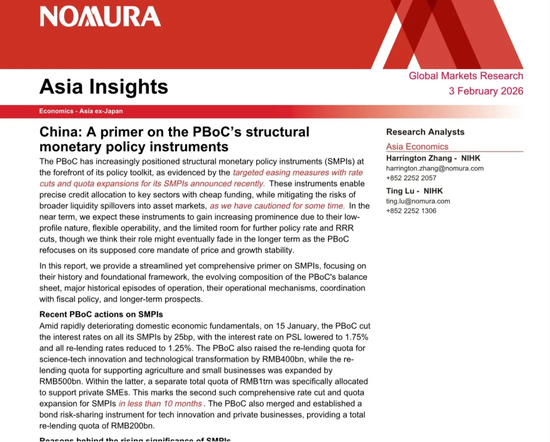2026年2月3日野村国际(香港)发布的《China: A primer on the PBoC’s structural monetary policy instruments》研报指出,当前中国央行结构性货币政策工具(SMPIs)已成为货币政策工具箱核心,短期仍将持续发力,但因模糊货币与财政政策边界等弊端,长期终将回归常规货币政策框架,这一结论打破了市场对结构性工具成为永久政策的认知。