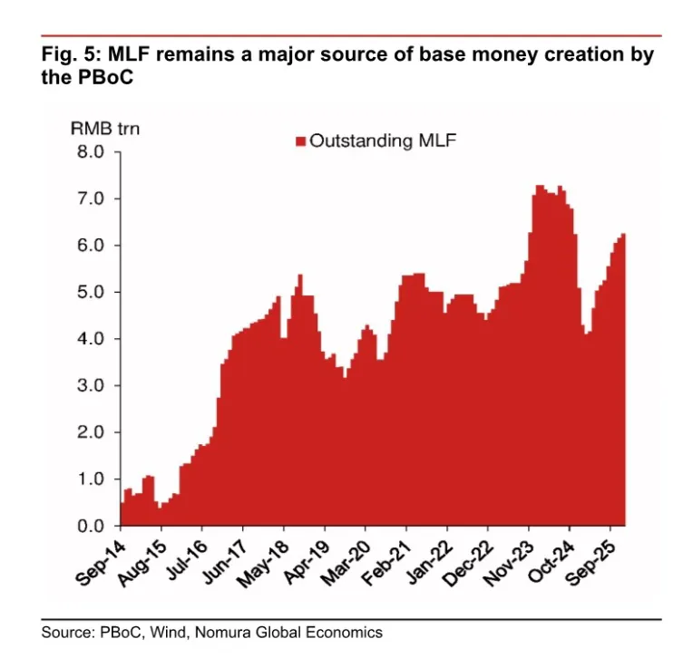 图5(研报P3) 呈现了中期借贷便利(MLF)的规模走势,截至2025年9月其余额维持在6万亿左右,仍是央行基础货币投放的重要抓手,与结构性工具、逆回购共同构成当前流动性投放的三驾马车。图8(研报P7) 清晰反映出抵押补充贷款(PSL)的规模变化,从2024年2月峰值3.402万亿持续回落至2025年末的1.029万亿,而2024年10月推出的正回购则飙升至6.5万亿,成为对冲PSL收缩的关键工具。