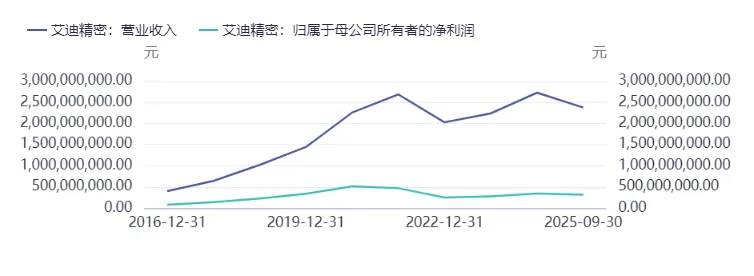 艾迪精密近年来营业收入和利润呈现波动趋势,2025年第三季度实现了显著增长。2025年前三季度,艾迪精密实现营业收入23.7亿元,同比增长16.5%,其中第三季度营业收入为8.1亿元,同比增长23.6%[14][75]。归属于母公司所有者的净利润为3.16亿元,同比增长12.63%。尽管2022年和2023年营业收入有波动,但2024年和2025年前三季度显示出稳定的增长势头。公司预计2025年全年营业收入将达到320.5亿元,显示出对未来市场的信心。