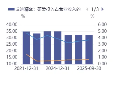 艾迪精密的毛利率和净利率在未来几年将呈现下降趋势,但整体保持在较高水平。2025年第三季度,公司毛利率为28.57%,同比下降1.8个百分点;净利率为13.53%,同比下降0.3个百分点。预计未来几年,公司毛利率将保持在29.3%至29.7%之间,显示出毛利率在未来几年将呈现下降趋势[78]。然而,净利率在2025年第三季度为13.24%,同比下降0.3个百分点[79]。公司表示,未来将继续加大产品研发投入,深化与国内外科研机构及高等院校的合作,以提升整体盈利能力[53]。公司还表示,破碎锤属具业务的毛利率提升至31.8%,显示出公司在高端市场的竞争力[80]。
