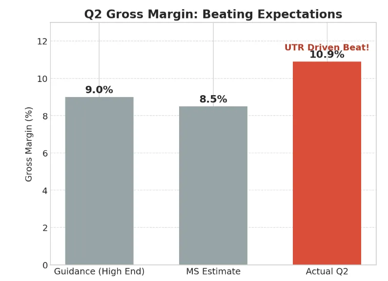 市场最大的担忧是:半导体复苏是不是伪命题?华虹用数据直接“打脸”了这种悲观情绪。核心论据1:产能利用率(UTR)突破天际你没看错,华虹在2025年Q2的产能利用率竟然达到了惊人的108%。这直接导致其毛利率达到10.9%,不仅比上个季度提升了1.7个百分点,更是一举击穿了大摩预测的8.5%和公司自己给出的7-9%的指引上限 。工厂机器转得冒烟,说明下游需求是真的回来了。核心论据2:Q3指引继续高歌猛进这波热度还没完。公司给出的2025年Q3营收指引为6.2亿-6.4亿美元,意味着环比还将增长10-13%。更重要的是,毛利率指引也稳中有升,预计达到10-12% 。这说明Q2的“爆单”不是昙花一现,而是有着持续的动力。02 | 护城河/竞争优势——不仅有12英寸,还有“涨价权”