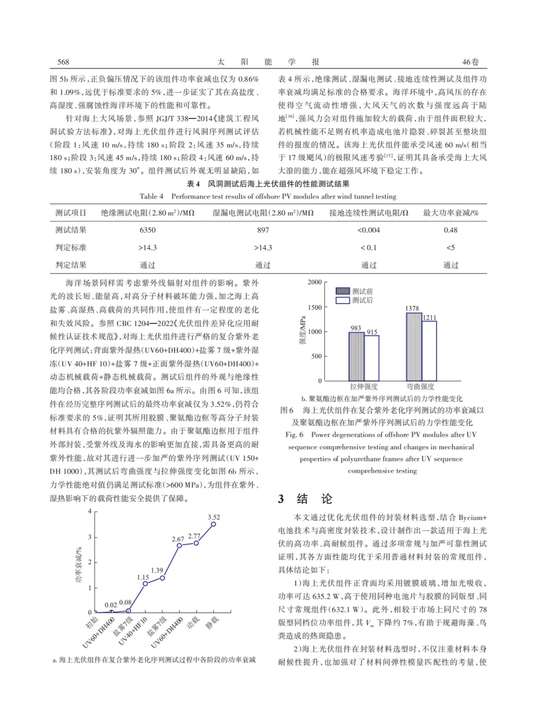 复合紫外老化序列测试:经历严格的紫外、湿热、盐雾、机械载荷循环测试后,海上组件最终功率衰减为3.52%,优于5%的标准要求。其聚氨酯边框在加严紫外老化后力学性能仍保持合格。