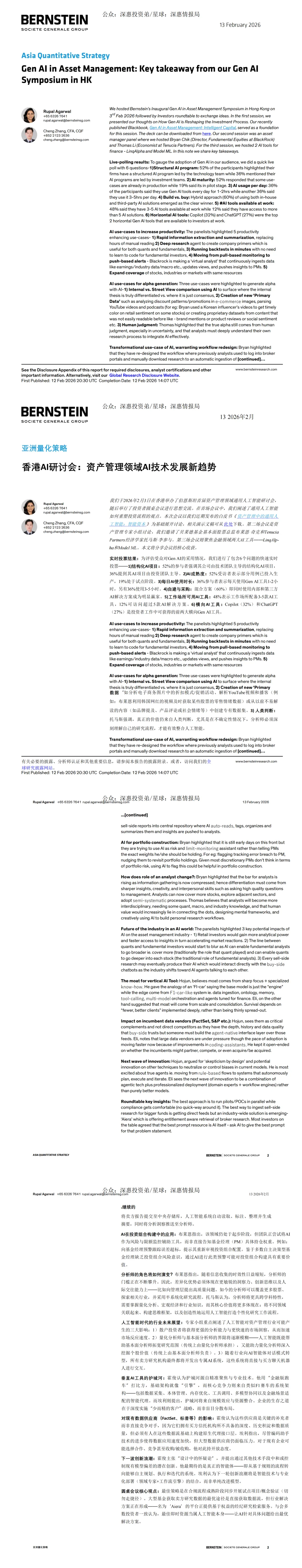 春节精选研报5:伯恩斯坦《亚洲量化策略_香港AI研讨会:资产管理领域AI技术发展新趋势》2026春节不停更,Day5,继续每日精选转载1家重点机构研报(天风、大摩、高盛等),从选题研究到内容打磨均倾注了大量时间与思考,希望能为你带来新的启发或帮助。如果觉得内容有用,欢迎点赞、转发、收藏,也欢迎在评论区分享你的看法,你的支持会成为博主前进的动力~以下转载自伯恩斯坦2026年2月13日发表的研报《亚洲量化策略_香港AI研讨会:资产管理领域AI技术发展新趋势》,为评估受众对Gen AI的采用情况,伯恩斯坦进行了包含6个问题的快速实时投票——1)结构化AI项目:52%的参与者强调其公司由技术团队主导的结构化AI项目,36%提到其AI项目由投资团队主导。2)AI成熟度:52%受访者表示部分用例已投入生产,19%处于试点阶段。3)每日AI使用时长:36%参与者表示每天使用Gen AI工具1-2小时,另有36%使用3-5小时。 4)自建与采购:混合方(60%)即同时使用内部和第三方AI解决方案成为明显赢家。5)工作场所可用AI工具:48%表示工作场所配备3-5款AI工具,12%可访问超过5款AI解决方案。6)横向AI工具Copilot(32%)和ChatGPT(27%)是投资者工作中可获得的前两大横向Gen AI工具。欢迎研读:------------------------------------------------------------------------核心策略及更多核心情报,欢迎加入知识星球深惠情报局(含微信群)。