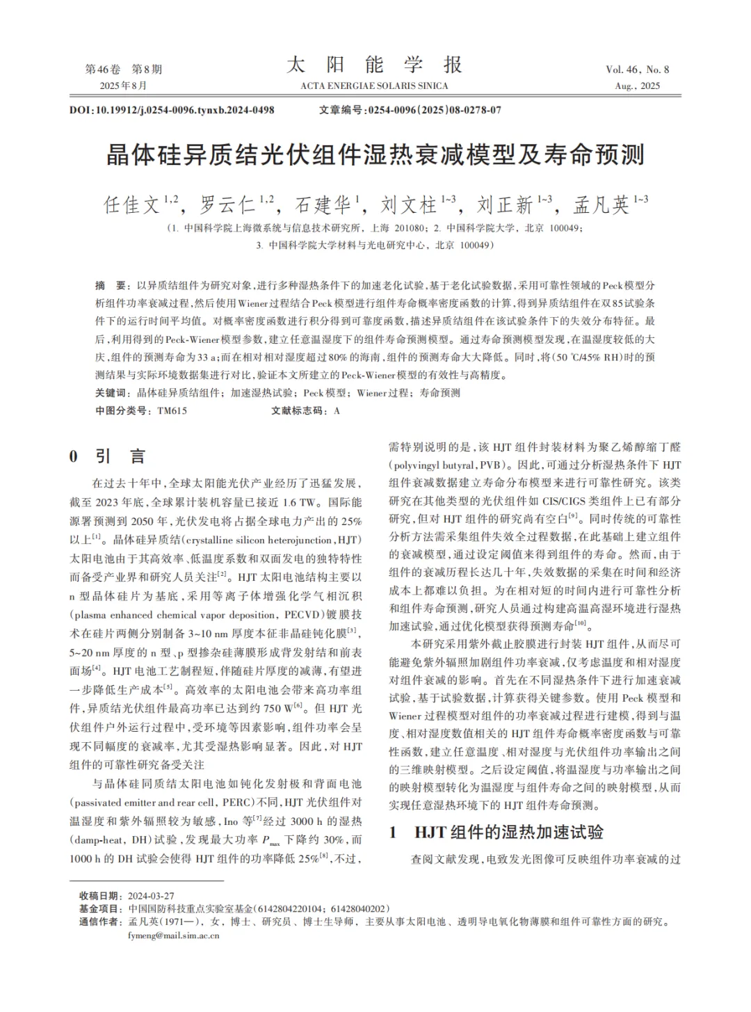 『研报』晶体硅异质结光伏组件湿热衰减模型及寿命预测