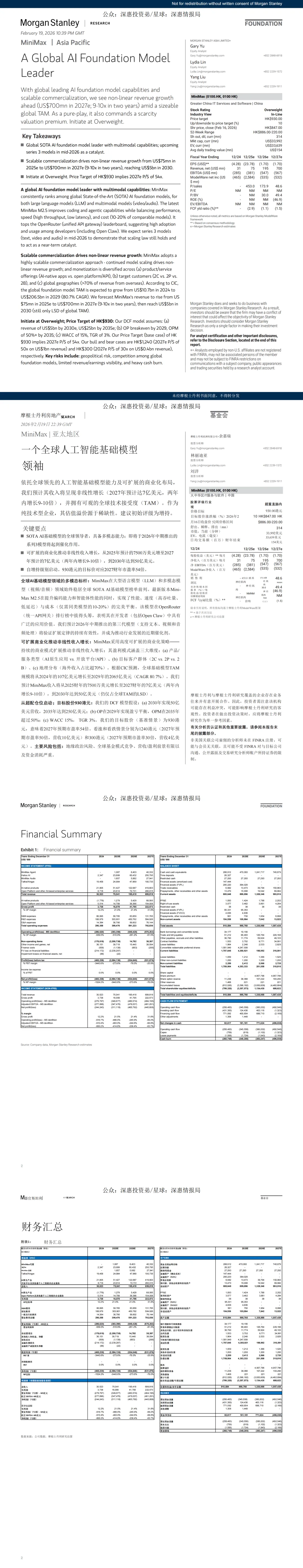 春节精选研报6:摩根士丹利《MiniMax _ 亚太地区_一个全球人工智能基础模型领袖》2026春节不停更,Day6,继续每日精选转载1家重点机构研报(天风、大摩、高盛等),从选题研究到内容打磨均倾注了大量时间与思考,希望能为你带来新的启发或帮助。如果觉得内容有用,欢迎点赞、转发、收藏,也欢迎在评论区分享你的看法,你的支持会成为博主前进的动力~以下转载自摩根士丹利2026年2月19日发表的研报《MiniMax _ 亚太地区_一个全球人工智能基础模型领袖》,依托全球领先的人工智能基础模型能力及可扩展的商业化布局,高盛预计其收入将呈现非线性增长(2027年预计达7亿美元,两年内增长9-10倍),并拥有可观的全球技术接受度(TAM)。作为纯技术型企业,其估值溢价源于稀缺性。建议初始评级为增持。欢迎研读:------------------------------------------------------------------------核心策略及更多核心情报,欢迎加入知识星球深惠情报局(含微信群)。