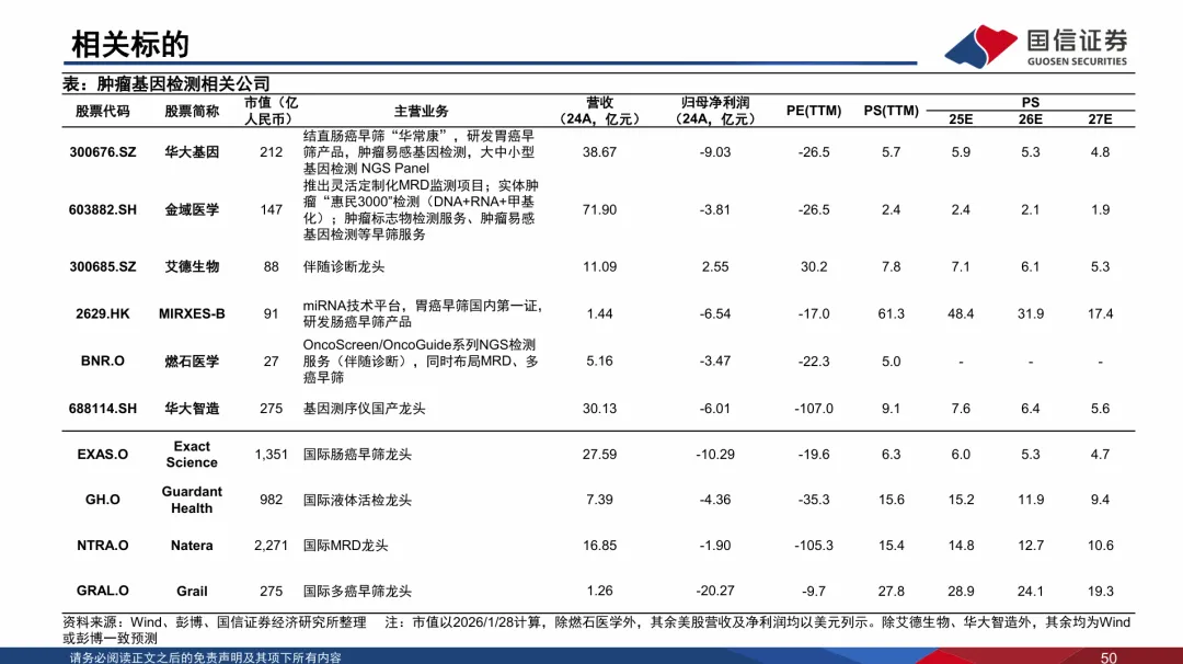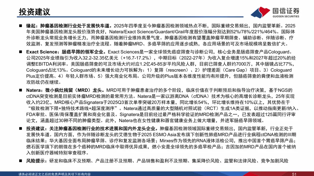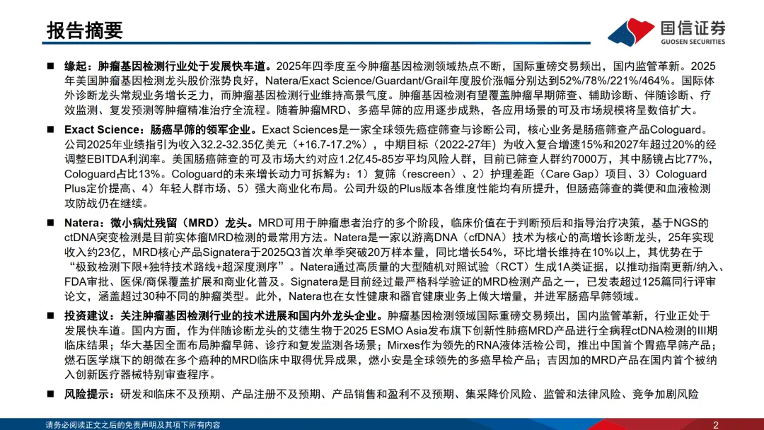 2026年2月国信证券发布的肿瘤基因检测行业深度报告指出,该行业正处于发展快车道,国际重磅交易频出,国内监管持续革新,成为体外诊断领域成长性最佳的细分赛道之一。