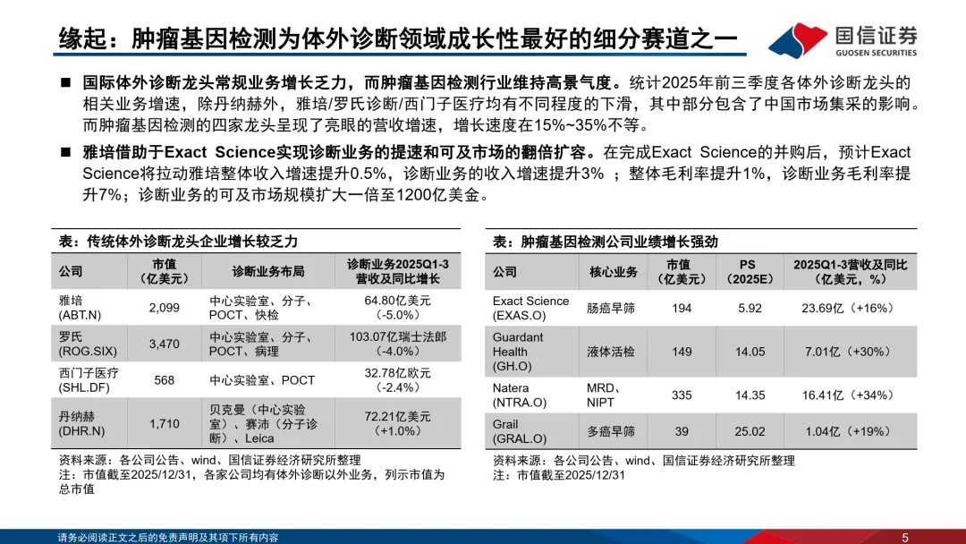 2025年美国肿瘤基因检测龙头股价涨幅显著,Grail、Guardant、Exact Science、Natera 涨幅分别达 464%、221%、78%、52%,而传统体外诊断龙头常规业务增长乏力,头部肿瘤基因检测企业营收增速达15%-35%。