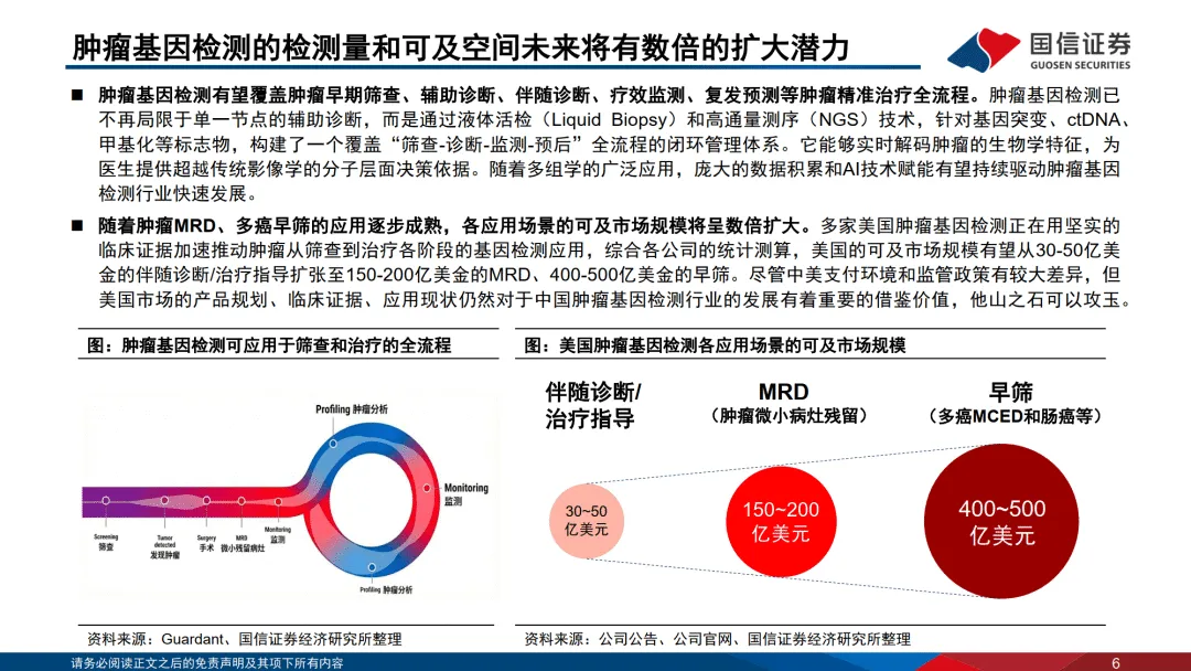 该行业技术覆盖肿瘤早筛、诊断、疗效监测等全流程,美国市场伴随诊断、MRD、早筛的可及市场规模预计将分别达 30-50 亿、150-200 亿、400-500 亿美元,为国内发展提供重要借鉴。