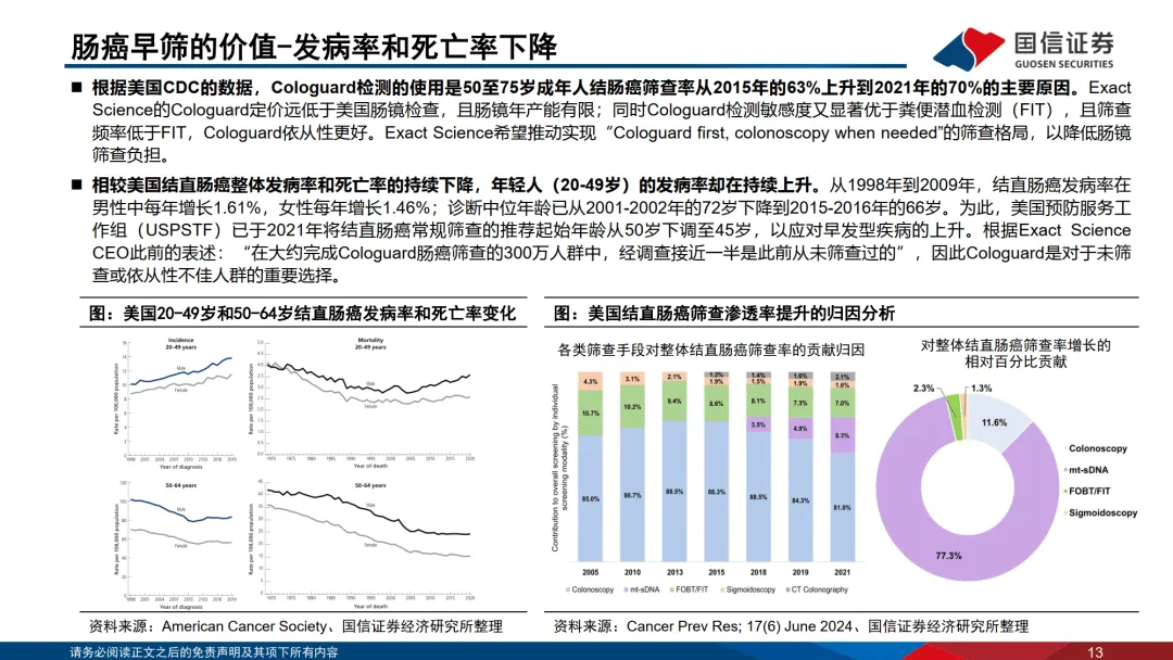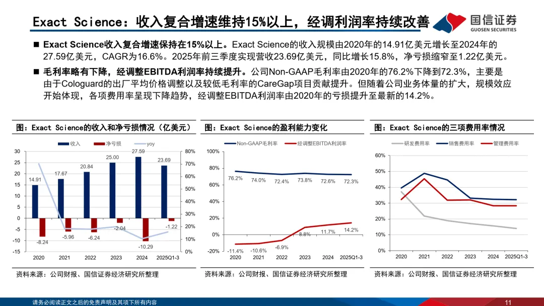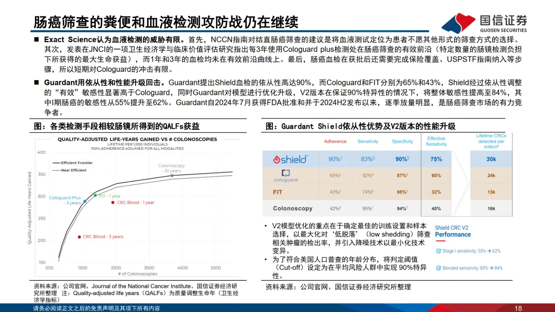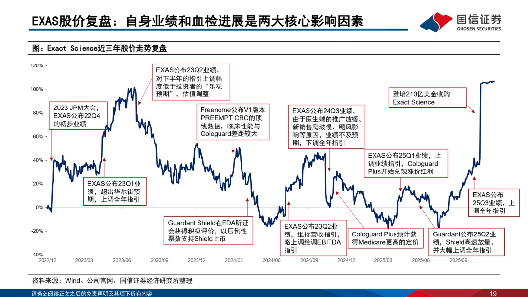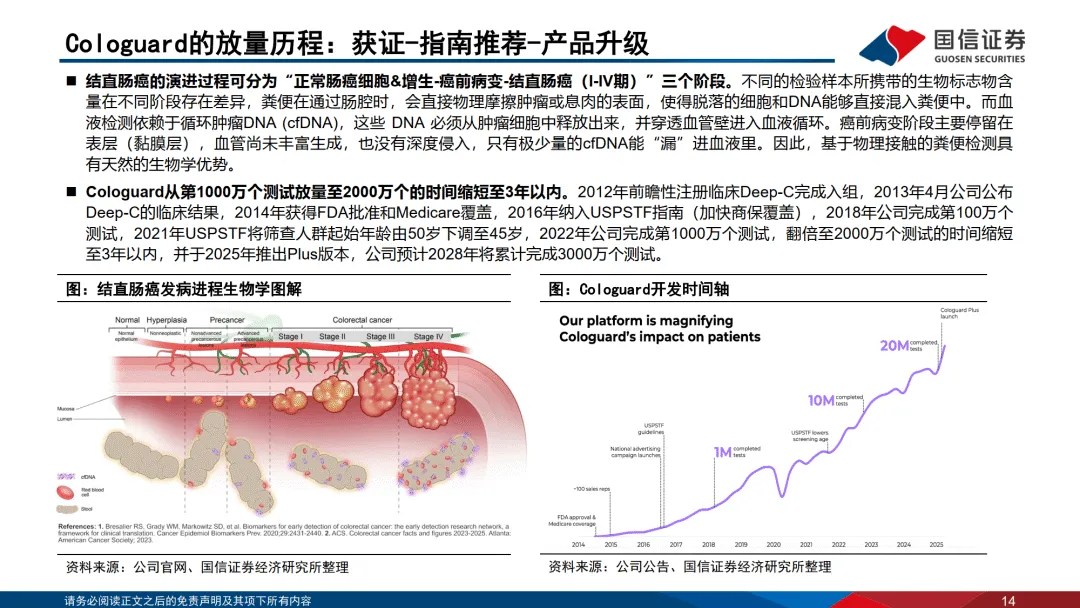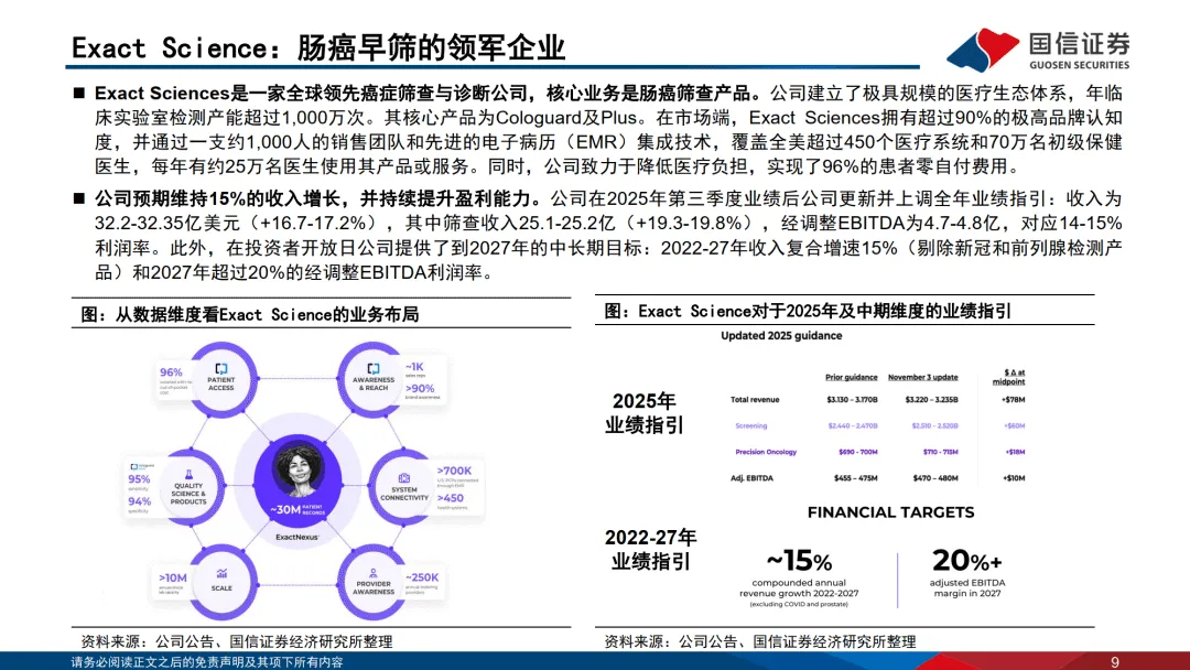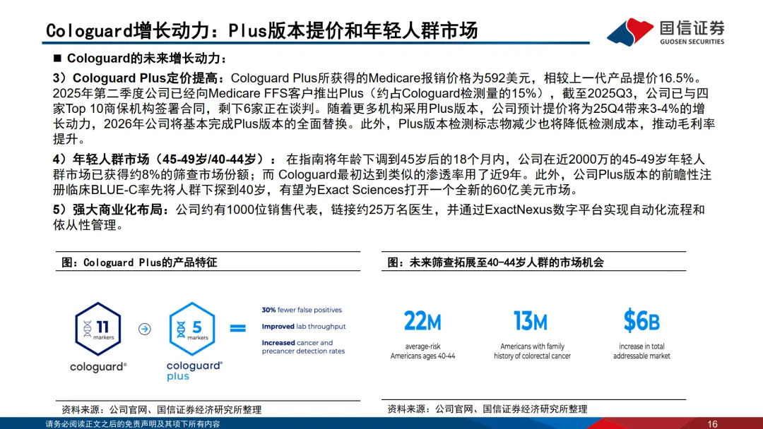 Exact Science作为肠癌早筛领军者,核心产品Cologuard市占率 13%,2025年营收指引32.2-32.35亿美元,Plus版本性能升级且提价16.5%,复筛、年轻人群市场等成为增长动力,粪便检测与血检的市场竞争仍在持续;