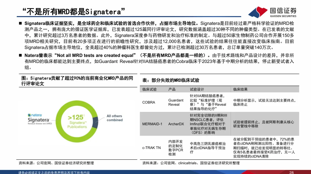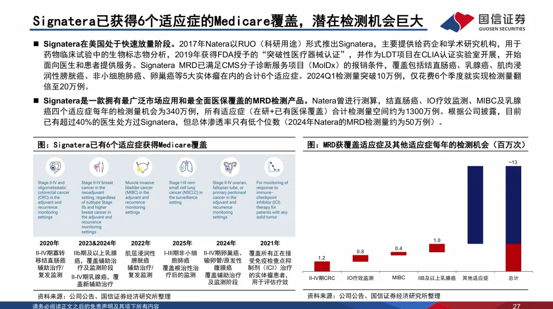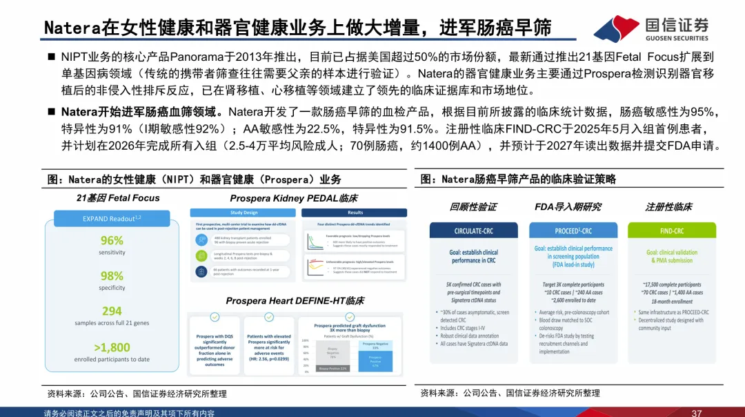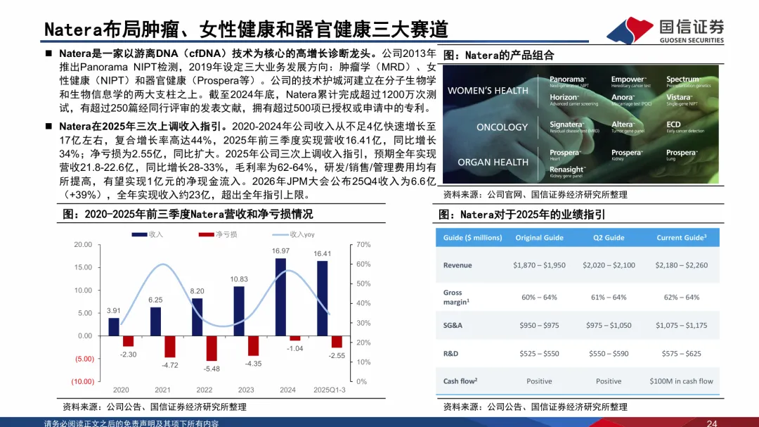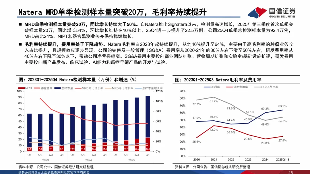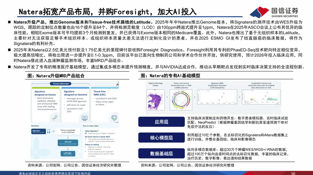 Natera是MRD领域龙头,核心产品Signatera 2025Q3 单季样本量破20万,凭借极致检测下限、超深度测序等技术优势,拥有超125篇同行评审论文,其通过高质量RCT研究推动医保覆盖,已获6个适应症Medicare报销,同时布局女性健康、器官健康业务,并进军肠癌早筛领域。