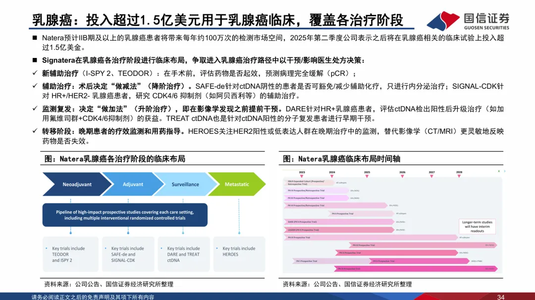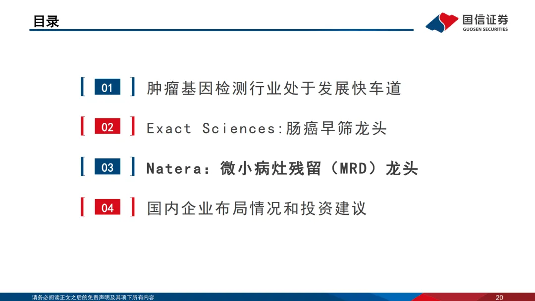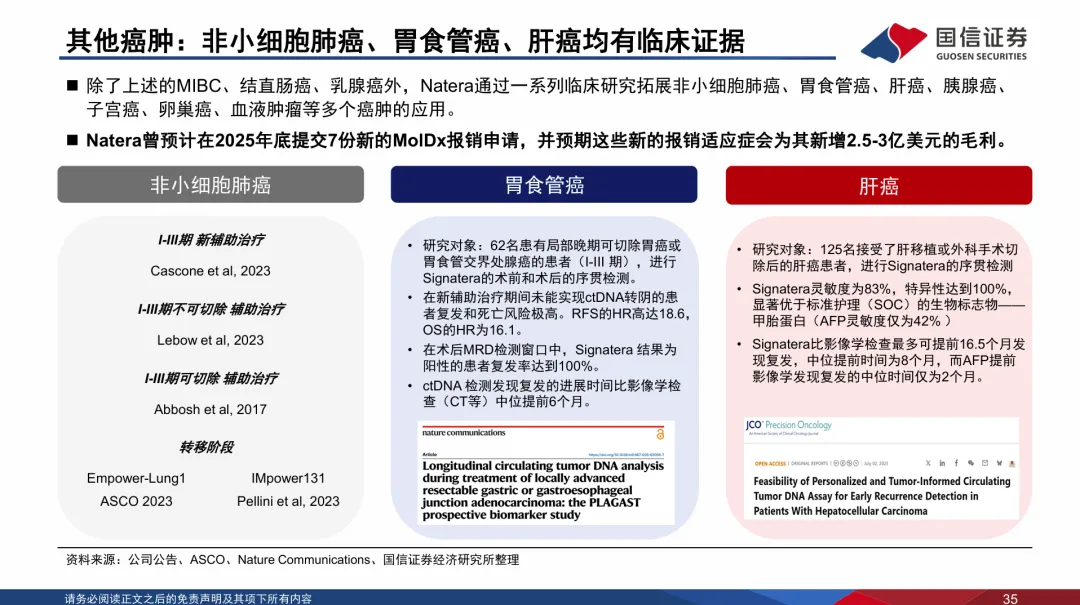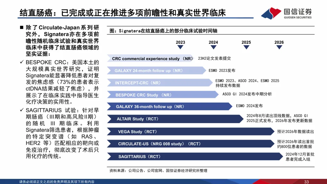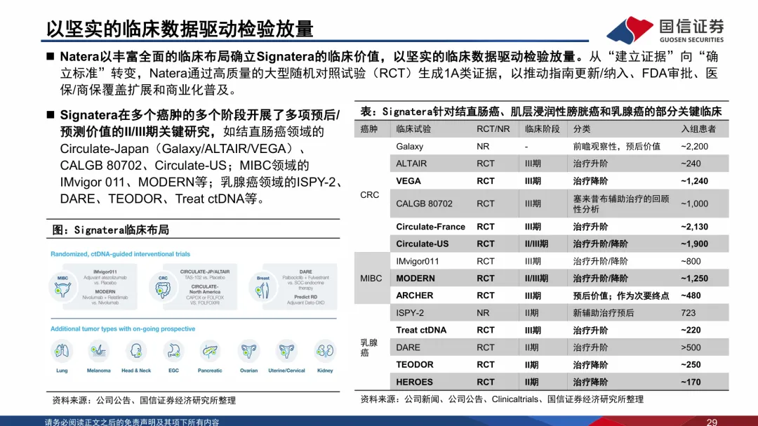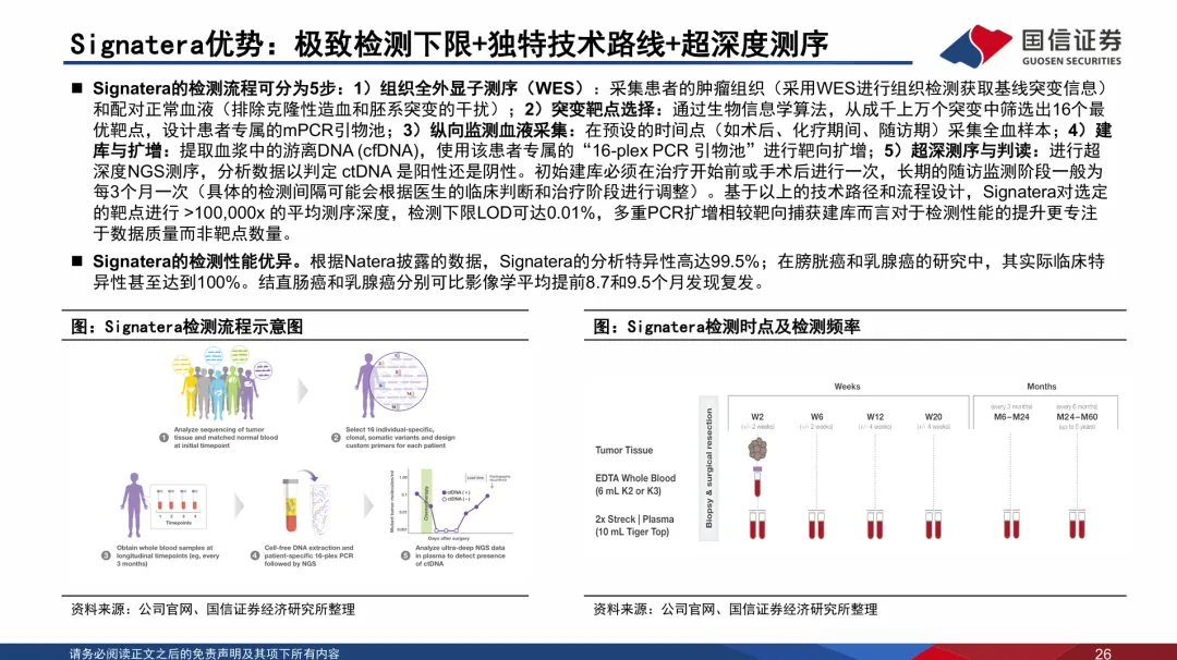 Natera是MRD领域龙头,核心产品Signatera 2025Q3 单季样本量破20万,凭借极致检测下限、超深度测序等技术优势,拥有超125篇同行评审论文,其通过高质量RCT研究推动医保覆盖,已获6个适应症Medicare报销,同时布局女性健康、器官健康业务,并进军肠癌早筛领域。