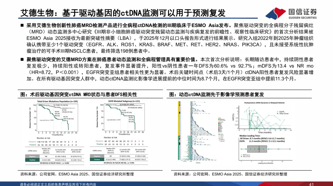 艾德生物作为伴随诊断龙头,肺癌MRD产品III期临床结果优异,ctDNA监测比影像学提前 8.7 个月预测复发;