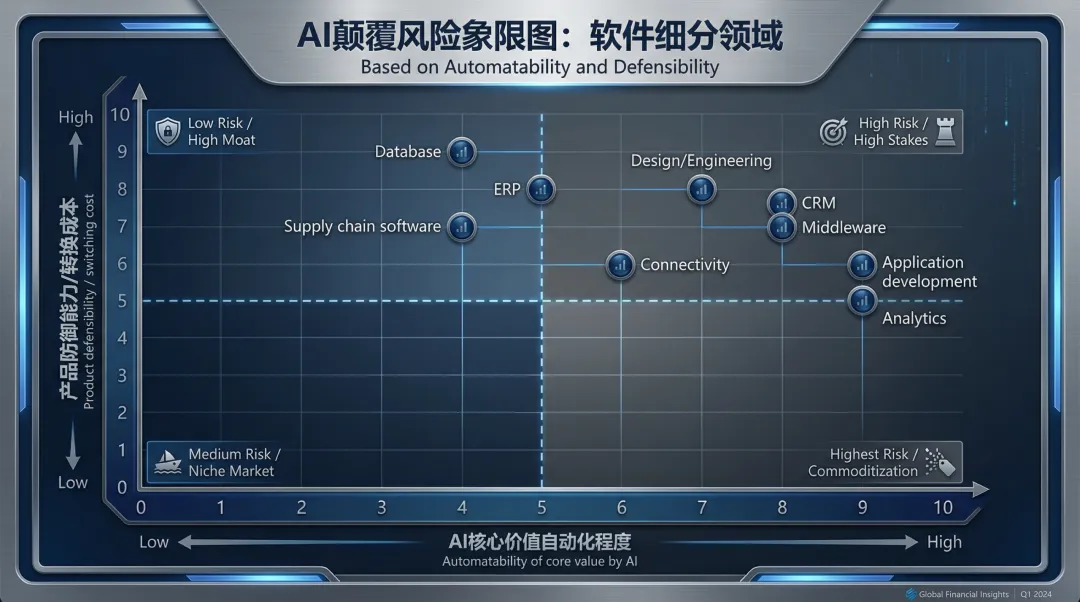 该图清晰展示了不同软件细分领域在AI冲击下的脆弱性。例如,**数据库(Database)和ERP(企业资源规划)由于其较高的产品防御能力和转换成本,虽然AI自动化程度中等,但风险相对较低。而应用开发(Application development)和分析(Analytics)**等领域,由于AI自动化程度高且产品防御能力相对较低,可能面临更高的颠覆风险。