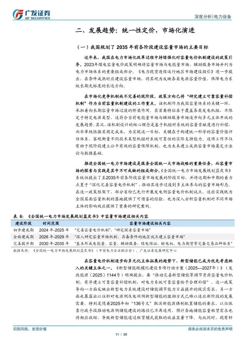 在推进全国统一电力市场建设方面,容量市场的探索与实践是其中不可或缺的组成部分。《全国统一电力市场发展规划蓝皮书》系统性提出了至2035年前各阶段容量市场发展的阶段目标,并将近期和中期的着力点置于“深化完善容量电价机制”,推动其逐步过渡到多主体参与的容量市场形态。