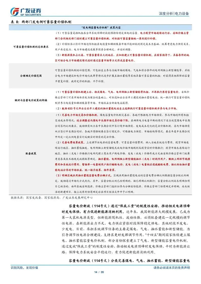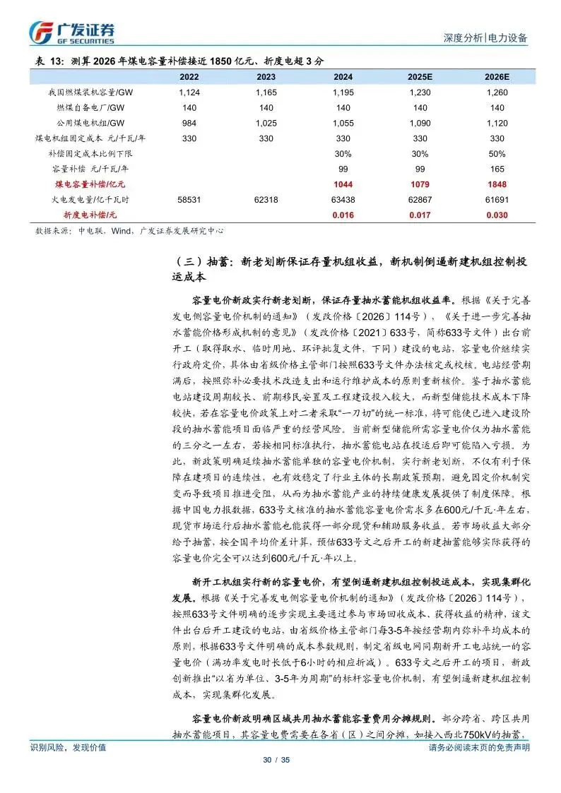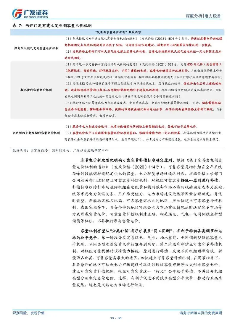 2026年1月30日,国家发展改革委、国家能源局发布《关于完善发电侧容量电价机制的通知》(发改价格〔2026〕114 号),强调:分类完善煤电、天然气发电、抽水蓄能、新型储能容量电价机制,优化电力市场机制,通过“保底工资”的制度性安排,推动相关电源顶峰时发电保供,有力促进新能源消纳利用。