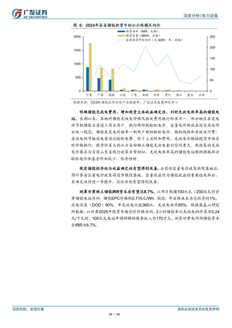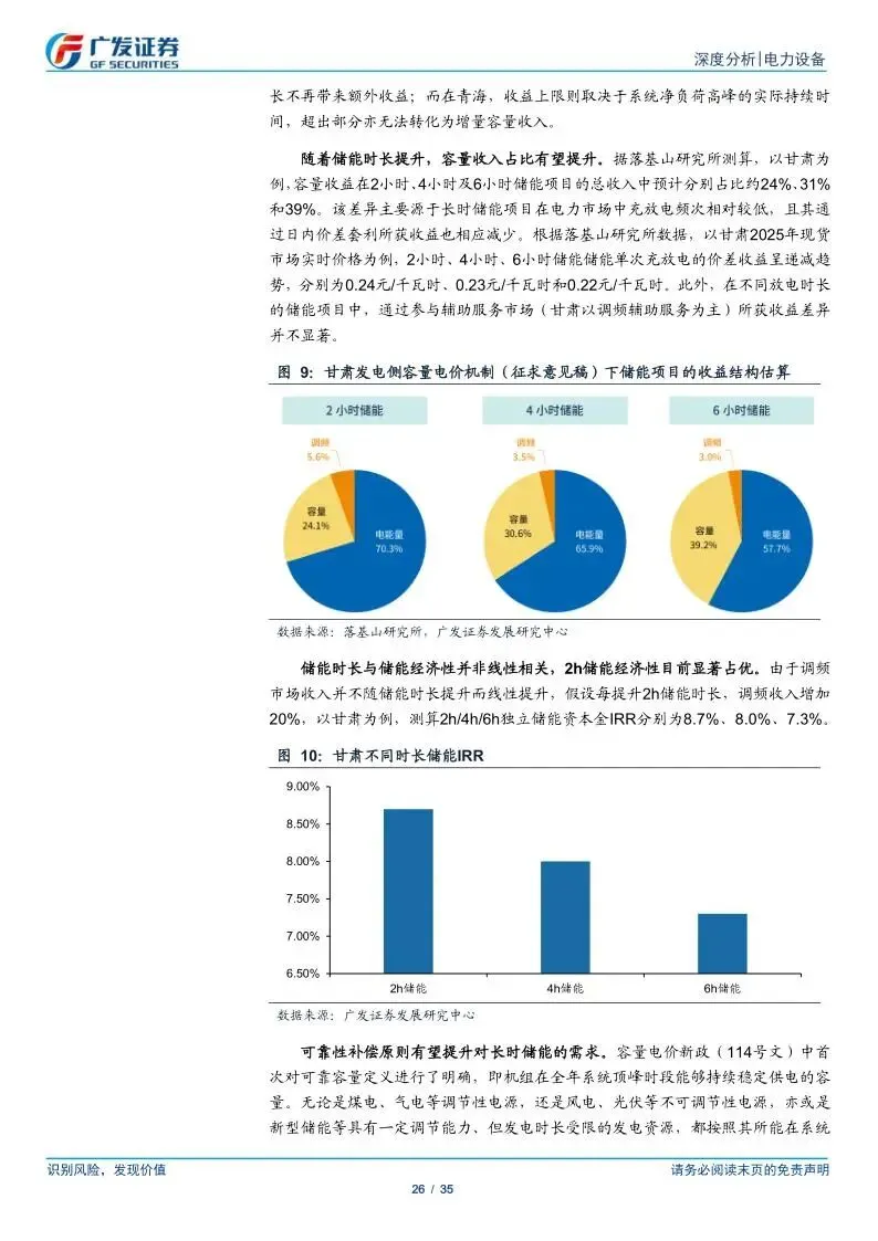 全国性容量电价政策框架落地后,预计各省容量电价政策将逐步跟随落地,容量收益作为储能收益的重要组成部分,储能确定性将进一步提升,且经济性有望得到改善。可靠性补偿原则有望提升对长时储能的需求。
