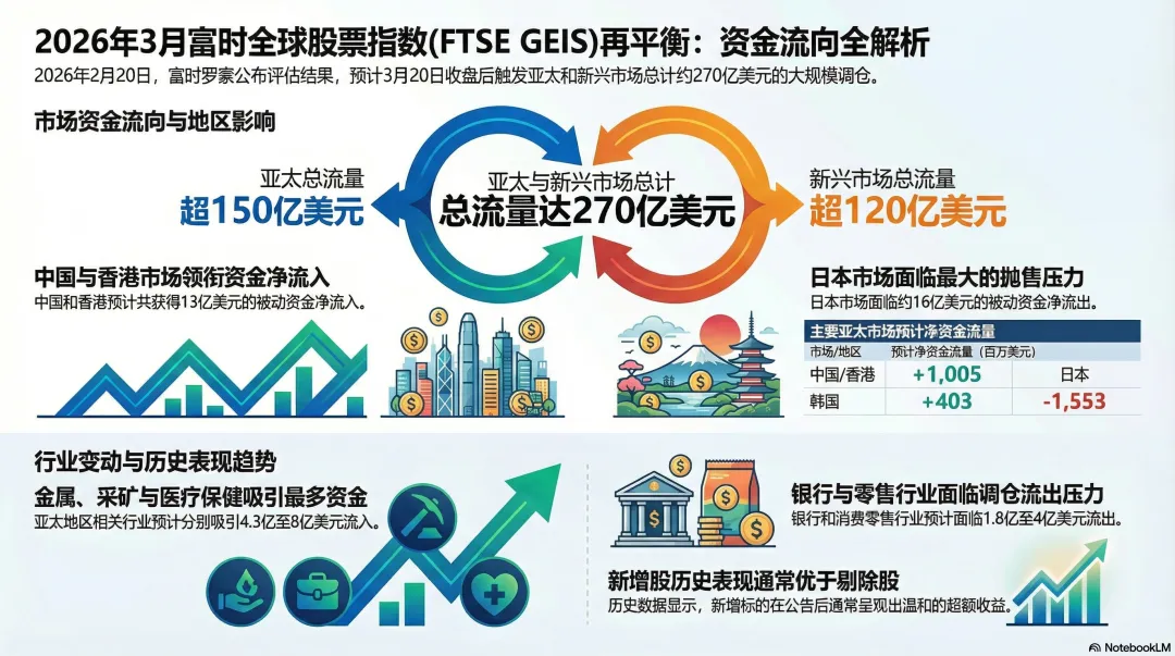 高盛研报-深度解析富时GEIS指数调仓,13亿美元增量资金或将“定向”注入中国市场2月20日盘后,富时罗素(FTSE Russell)公布了其全球股票指数系列(GEIS)2026年3月的半年度审议初步结果 。作为全球被动基金配置的重要风向标,这一场涉及上百亿美元资金流动的“权力更迭”,不仅关乎上市公司的身价,更预示着区域市场间流动性的此消彼长 。 在这份高盛最新的深度研报中,我们看到了中国市场在这一轮调整中展现出的独特吸引力。 关键时间线:3月20日正式“入场” 本次指数审议的时间表已经明确,投资者需高度关注以下两个关键节点: 审议修正期: 截至3月6日,所有初步变动仍有修正可能 。正式生效日: 调整将于**3月20日(周五)**收盘后正式实施 。这意味着,绝大多数跟踪指数的被动资金将在当日最后时段进行集中换仓。变动规模:覆盖全球权益的“大换血” 本次调整并非小修小补。在涵盖大盘、中盘及小盘股的富时全球全指(All Cap Index)中,新纳入的成员规模可观: 全指变动: 发达市场新增119只个股,剔除83只;新兴市场则表现出更强的生命力,新增156只,仅剔除45只 。权重调整: 调整后,富时除美国外的发达市场全指市值预计达到31.4万亿美元(增长0.3%),新兴市场全指市值则达11.3万亿美元(增长0.7%) 。资金流向:中国市场成“吸金”主力 流动性是观察指数调整的核心视角。高盛预计,本次再平衡将触发亚太市场超过150亿美元、新兴市场超过120亿美元的买卖总流量 。 在净流入方面,中国/香港市场成为了本次调整的最大赢家 : 中港市场: 预计将迎来13亿美元 的被动资金净流入,位居亚太区首位 。日本市场: 则是另一番景象,预计面临约16亿美元 的净卖压,是承受资金流出压力最大的地区 。行业逻辑:从“传统防御”向“成长赛道”的资金位移 资金在不同版块间的流动呈现出清晰的逻辑分化。在亚太地区: 资金净流入行业: 金属与采矿、资本货物、医疗保健是主要流向,各行业预计获得约4.3亿至8亿美元的买入额 。资金净流出行业: 银行、消费零售、保险及金融服务、消费者必需品则面临套现压力,预计流出额在1.8亿至4亿美元之间 。战术建议:博弈“预告效应”与“生效溢价” 公告前后的反弹: 在公告发布前的10-20天,新增成分股通常表现低迷,但在公告发布后往往会迎来修复 。公告后的超额收益: 历史经验表明,公告发布后到正式实施前,新增个股通常会有温和的超额收益,尽管这一过程伴随着显著的波动 。对于投资者而言,紫金矿业(2299 HK)等高额被动流入预期的个股值得放在雷达监测范围 。然而,指数调整带来的股价脉冲往往具有短期性,基本面的支撑才是长期收益的底座 。