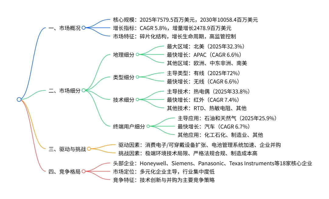 2025-2030 年全球温度传感器市场呈现加速增长态势,2025 年市场规模达 757950 万美元,预计 2030 年将增至 1005840 万美元,CAGR 为 5.8%,增量增长 247890 万美元;市场结构呈碎片化,北美是最大区域市场(2025 年占比 32.3%),APAC为增长最快区域(CAGR 6.6%);类型上有线传感器占主导(2025 年 72% 市场份额)但无线传感器增长更快(CAGR 6.6%);技术端热电偶是最大细分(2025 年 33.8%),红外传感器增长最快(CAGR 7.4%);应用端石油和天然气为最大终端市场(2025 年 25.9%),汽车行业增长领先(CAGR 6.7%);市场主要驱动因素包括消费电子与可穿戴设备扩张、电池管理系统加速发展,核心挑战为极端环境下的技术局限与严格法规合规要求,竞争格局由 Honeywell、Siemens、Texas Instruments 等多元化企业主导,行业集中度较低。